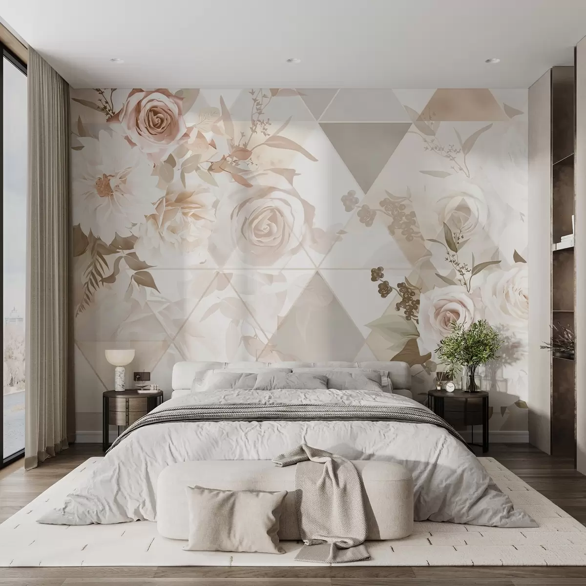 Fototapetak Rózsa- és bazsarózsacsokrok mintás háttéren világos bézs árnyalatokban Nr. w08679