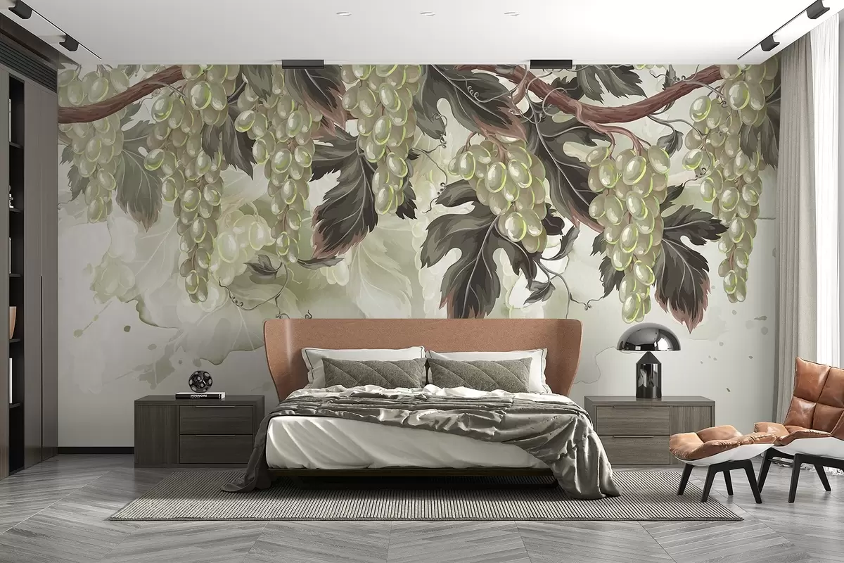 Fototapetak Szőlő lóg egy zöld leveles szőlőből, világos háttér előtt, akvarellszerű textúrákkal, világos színű háttérrel Nr. w08696