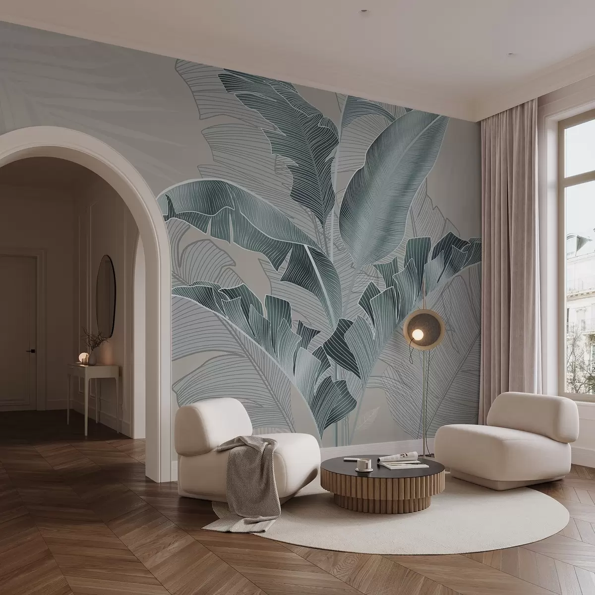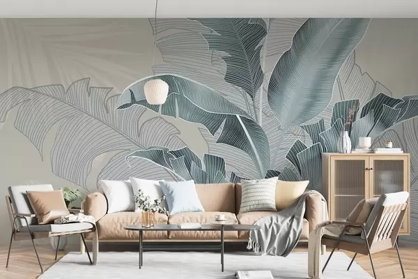 Fototapetak Bézs és türkiz árnyalatú trópusi levelek harmonikus kompozíciója, részletes vonalvezetéssel Nr. w08698v1