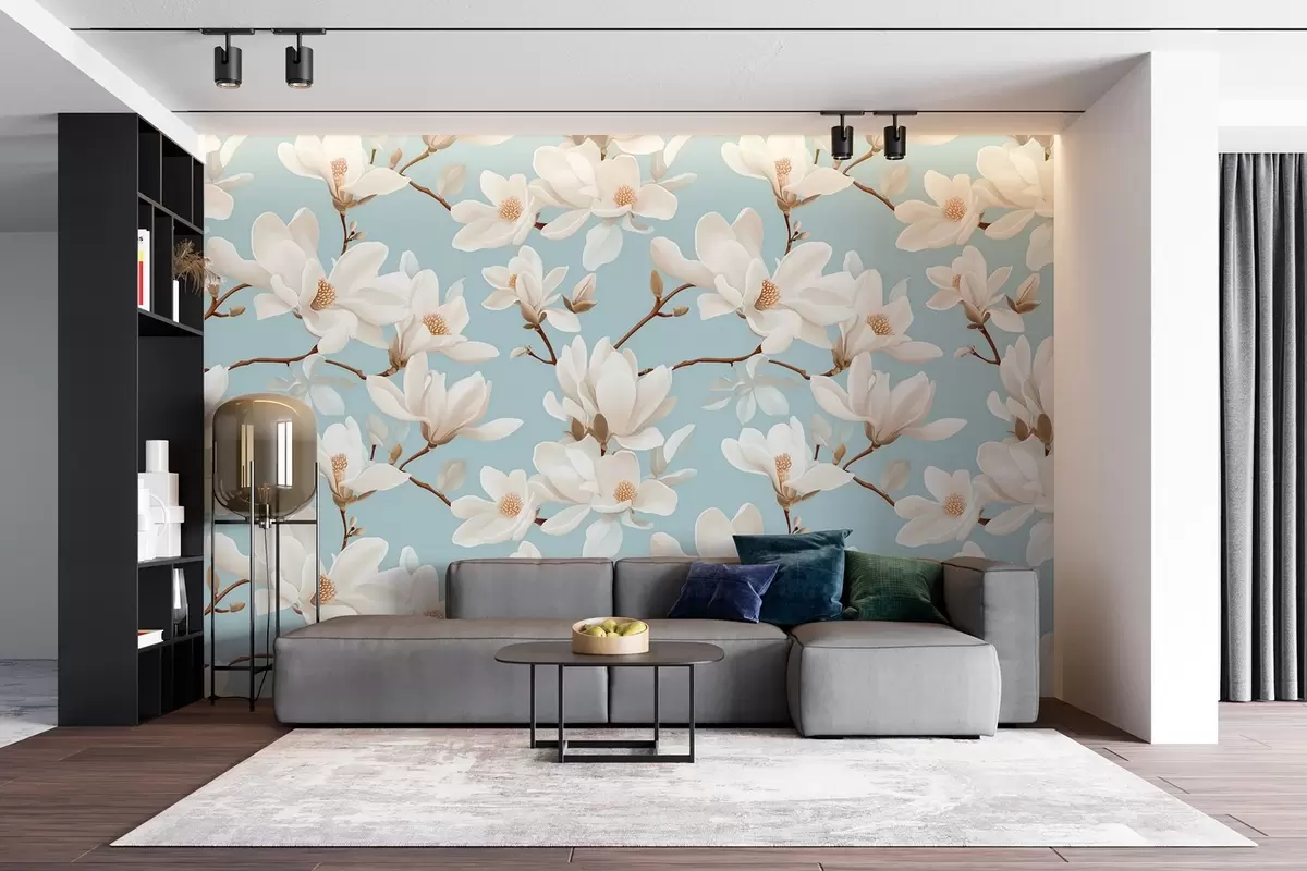 Fototapetak Fehér magnólia virágok mintája, pasztellkék háttér, fehér levelek és ágak Nr. w08726