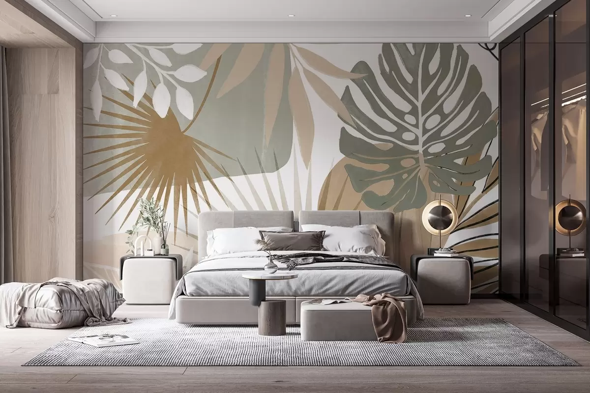Fototapetak Absztrakt design, amely különböző trópusi leveleket tartalmaz, zöld, bézs és krémszínű földes árnyalatokban Nr. w08738v1