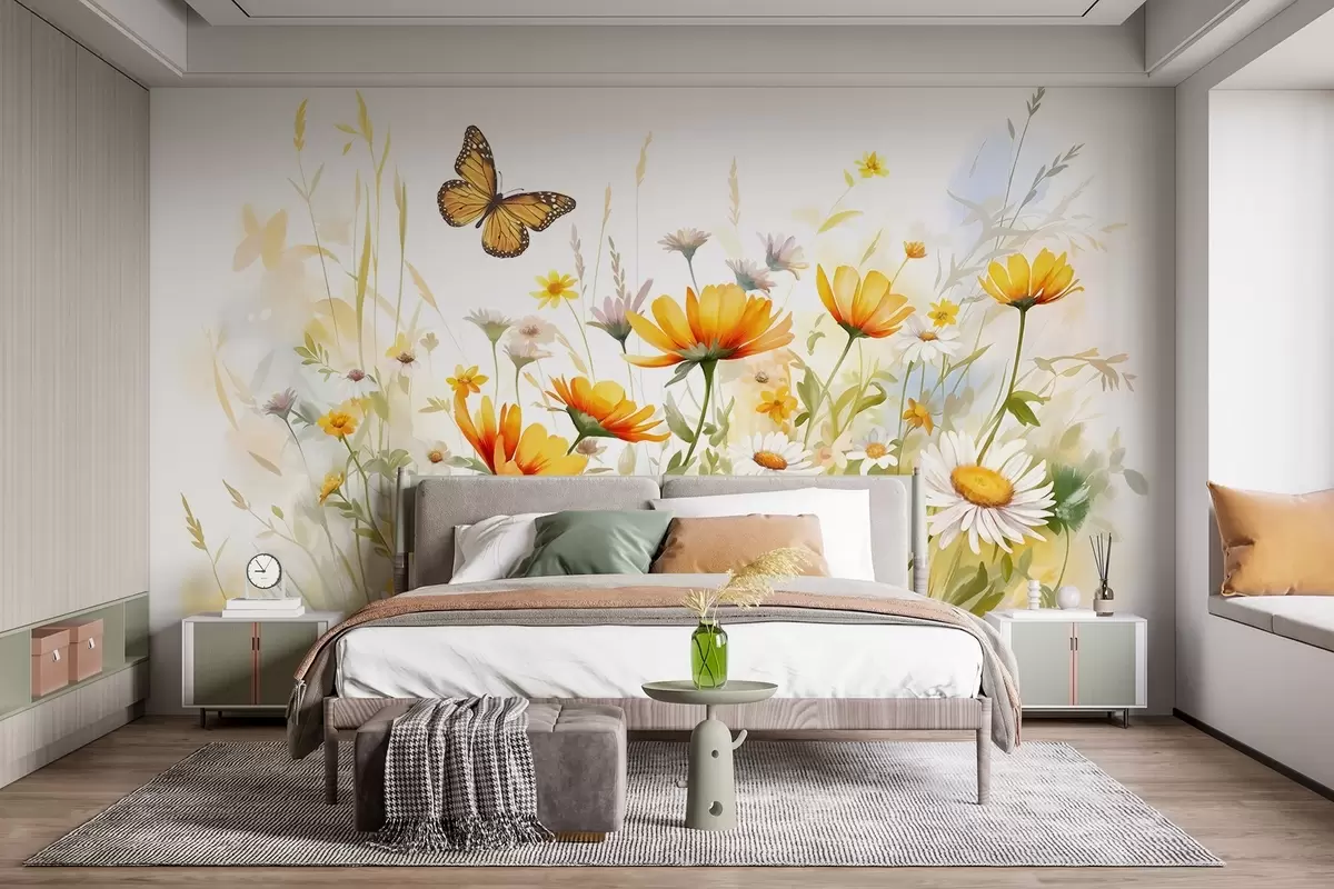Fototapetak Élénk, akvarellszerű virágmező narancssárga és sárga virágokkal, a virágok felett pillangóval Nr. w08739