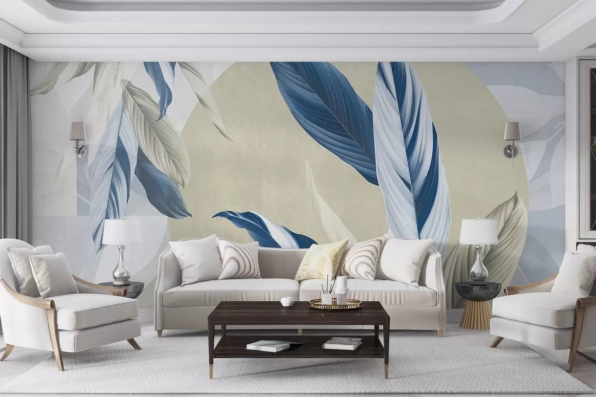 Fototapetak Modern és absztrakt geometrikus texturális kompozíció részletes levelekkel a kék, bézs és fehér árnyalataiban Nr. w08741