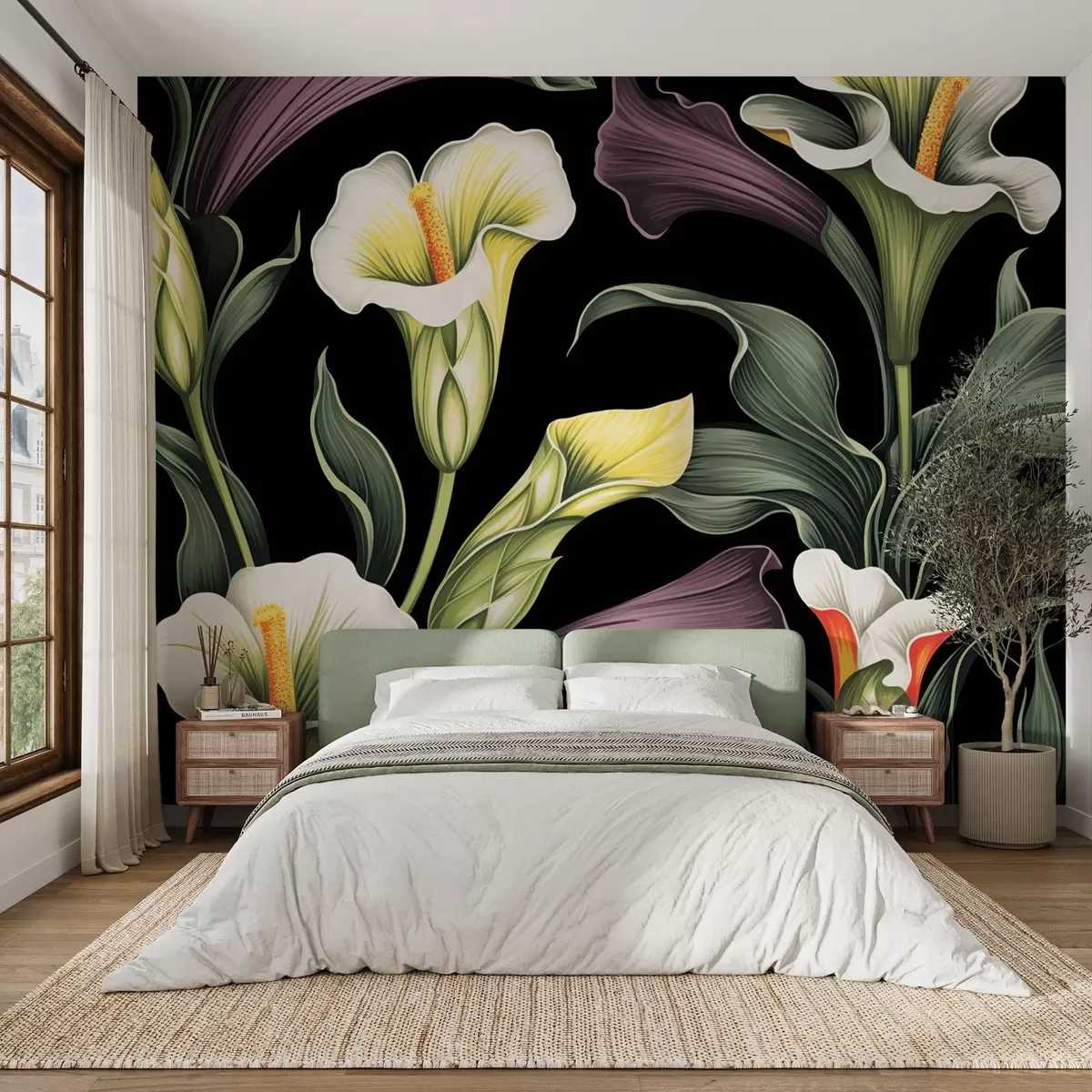 Fototapetak Fehér-zöld és lila kála liliomok fekete háttéren Nr. w08752