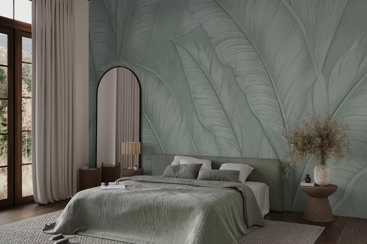 Fototapetak Erősen texturált, részletes, nagyméretű trópusi levelek monokróm zöld színben, loft stílusban Nr. w08772v1