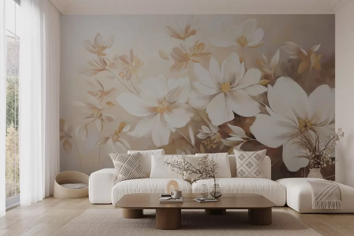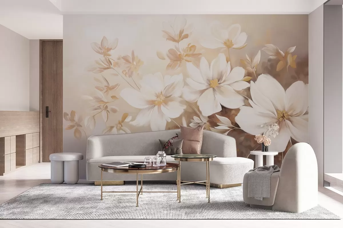 Fototapetak Fehér festett virágok, lágy szirmokkal és finom levelekkel, világos bézs és krémszínű háttér előtt Nr. w08780