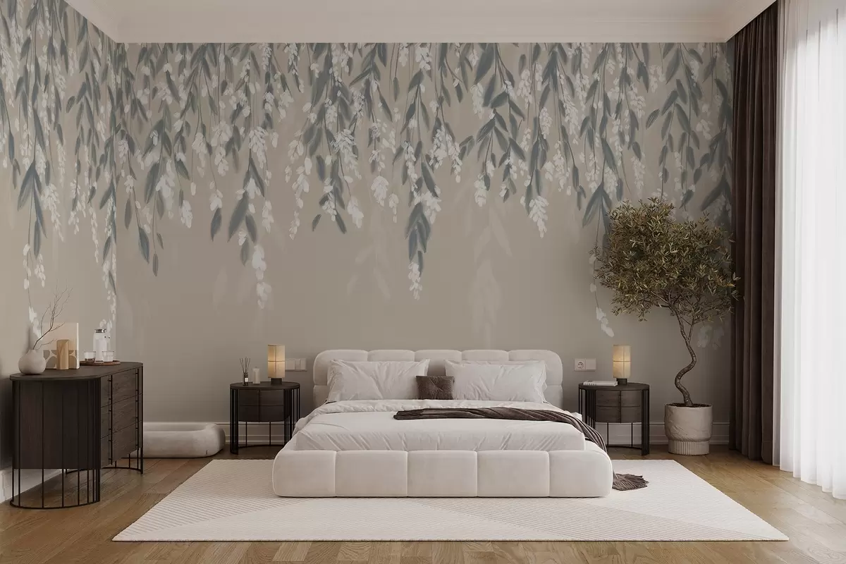 Fototapetak Lombozatos ágak kaszkádja tompa zöld árnyalatokban, fehér virágokkal és levelekkel bézs háttéren Nr. w08781