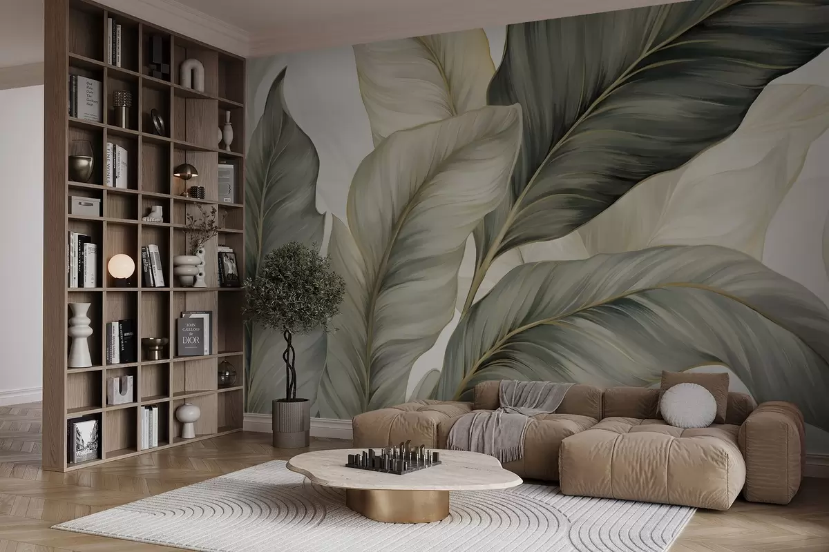 Fototapetak Nagyméretű, stilizált textúrájú levelek részletes erezettel, a zöld, krém és bézs különböző árnyalataiban Nr. w08785