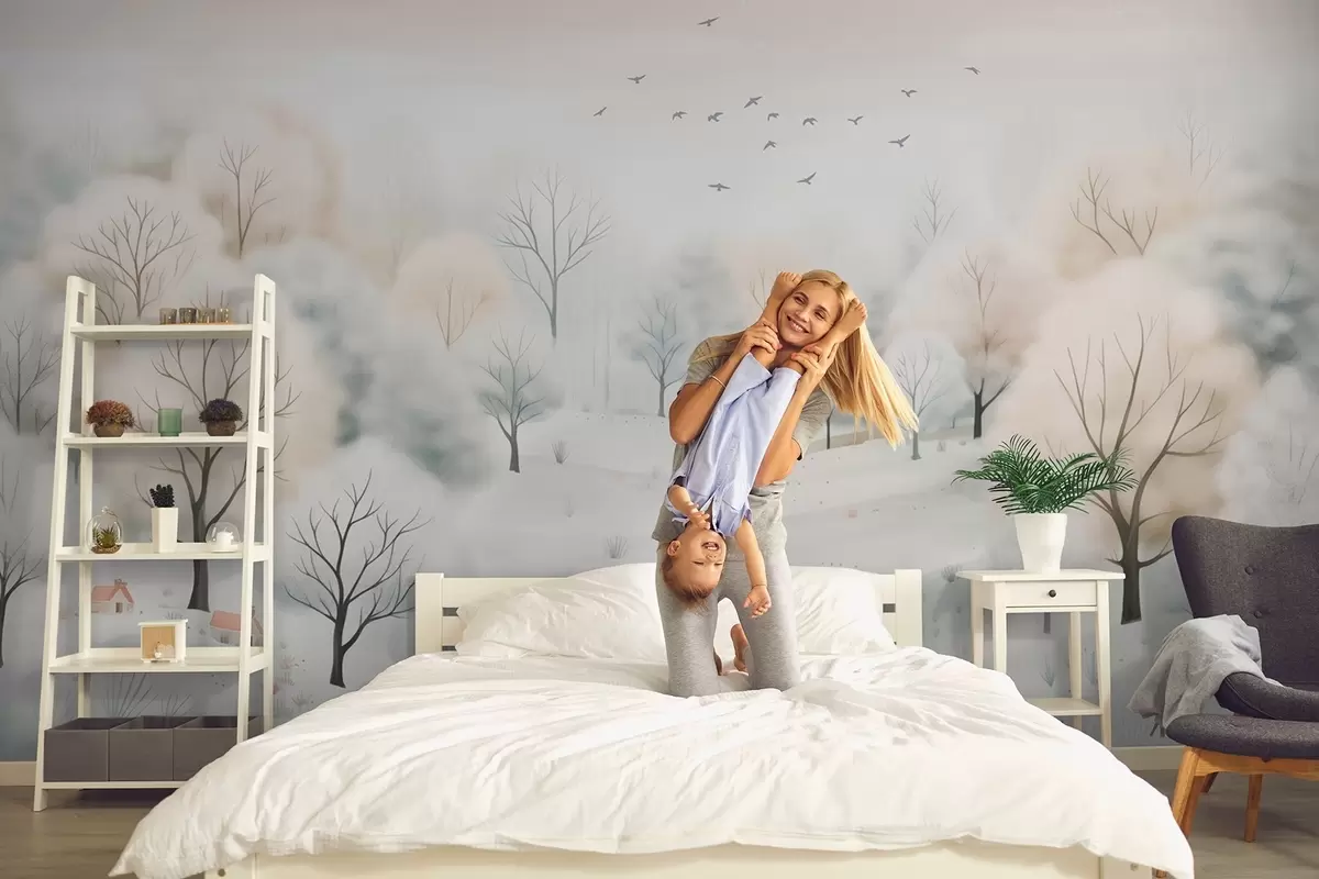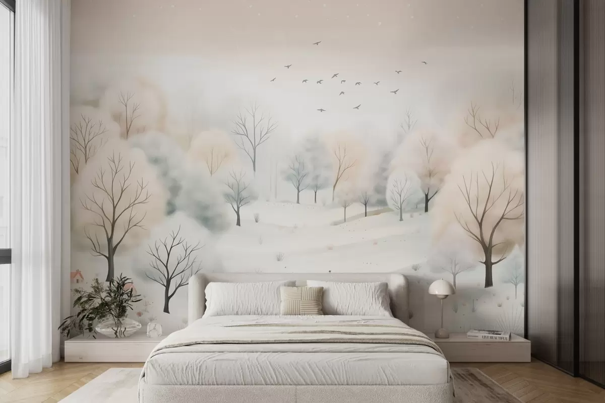 Fototapetak Téli erdő fákkal, kis házakkal, madarakkal és hóval, könnyed akvarell stílusban Nr. w08815