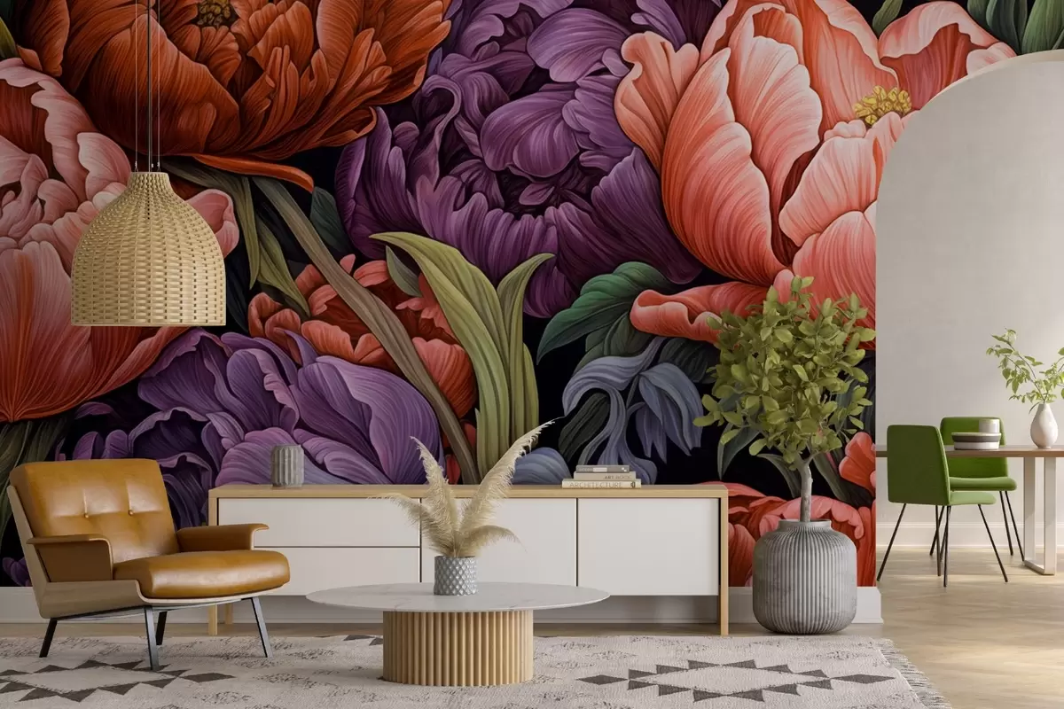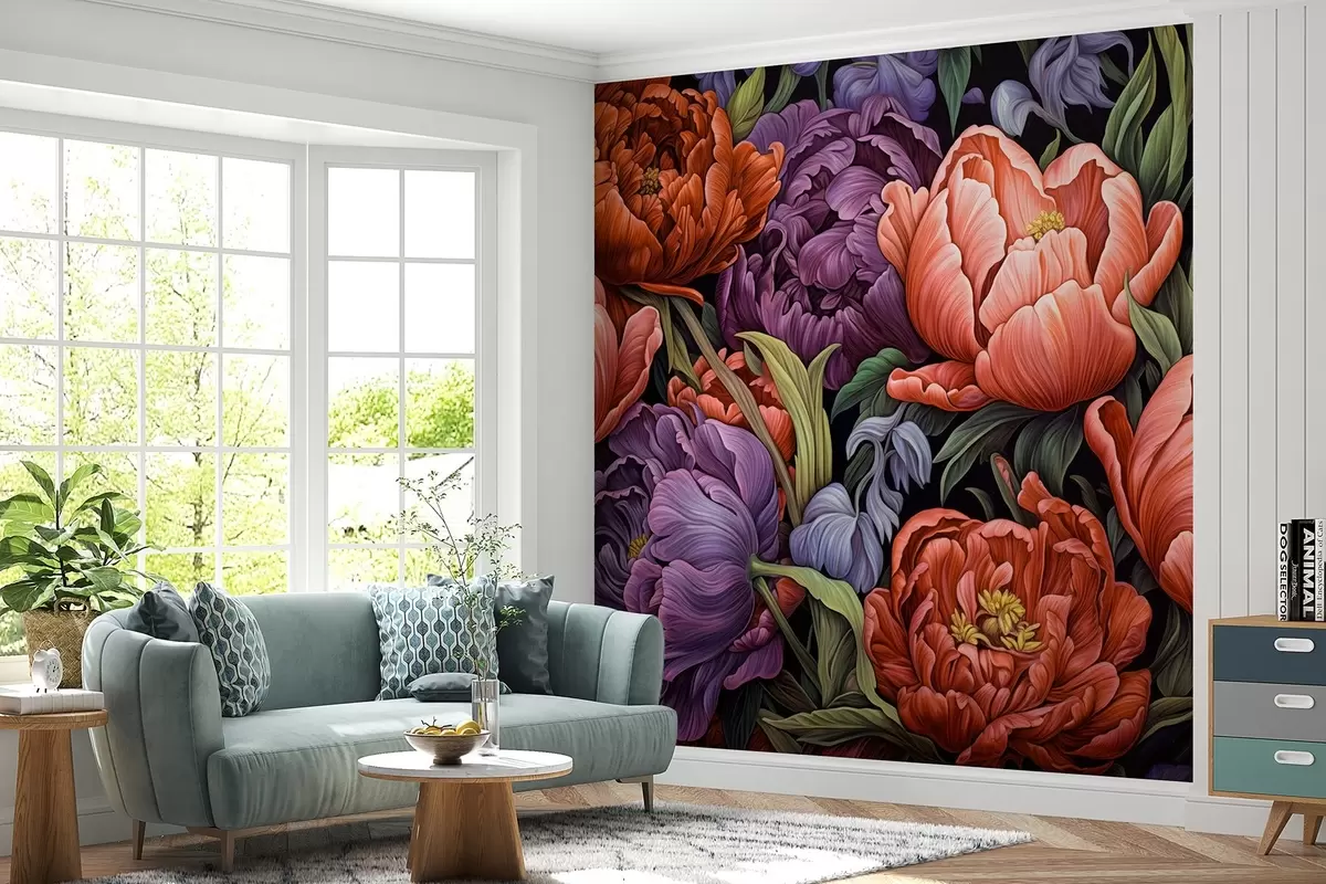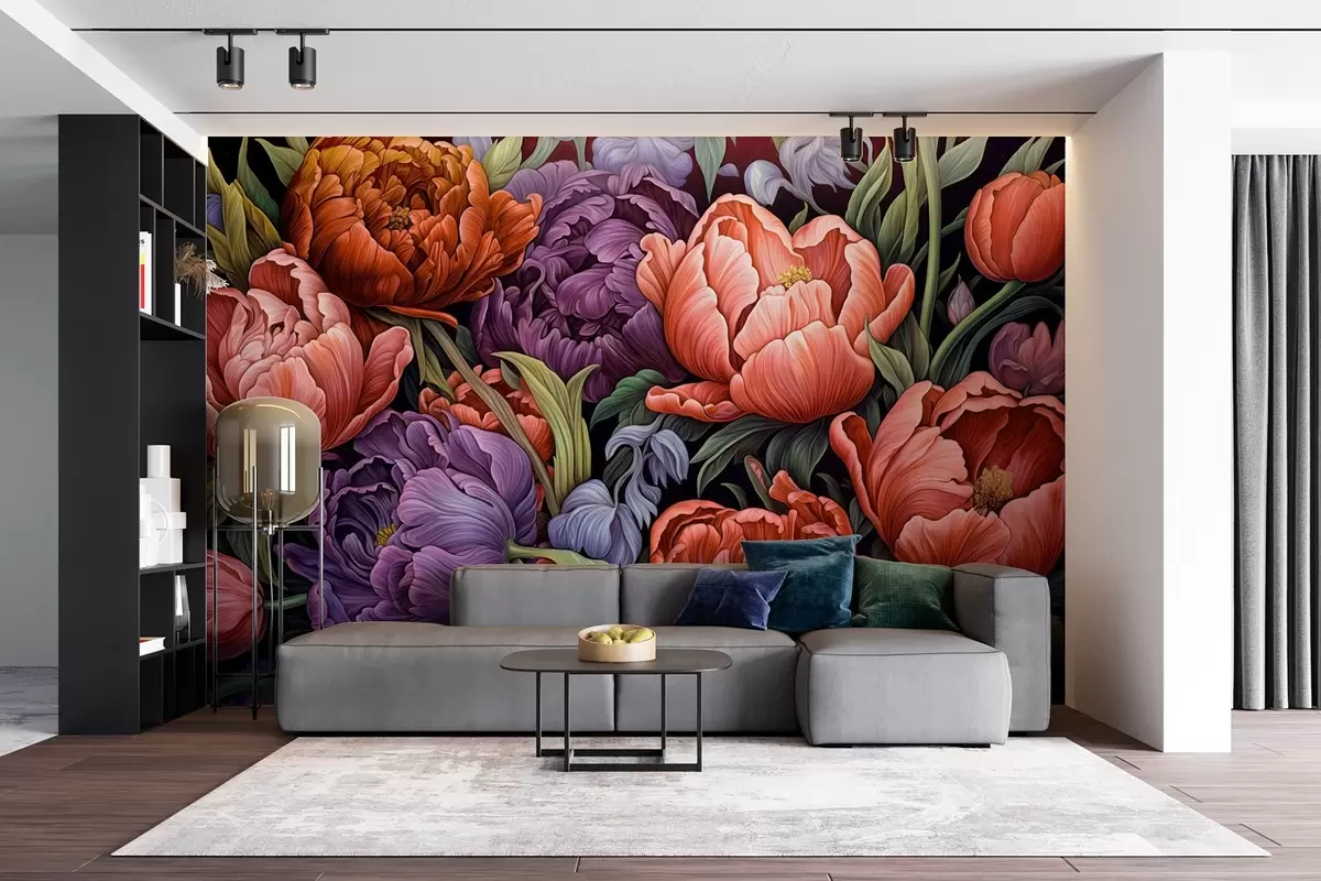 Fototapetak Tulipánok és bazsarózsák viktoriánus stílusban, piros és lila színekben Nr. w08818v1