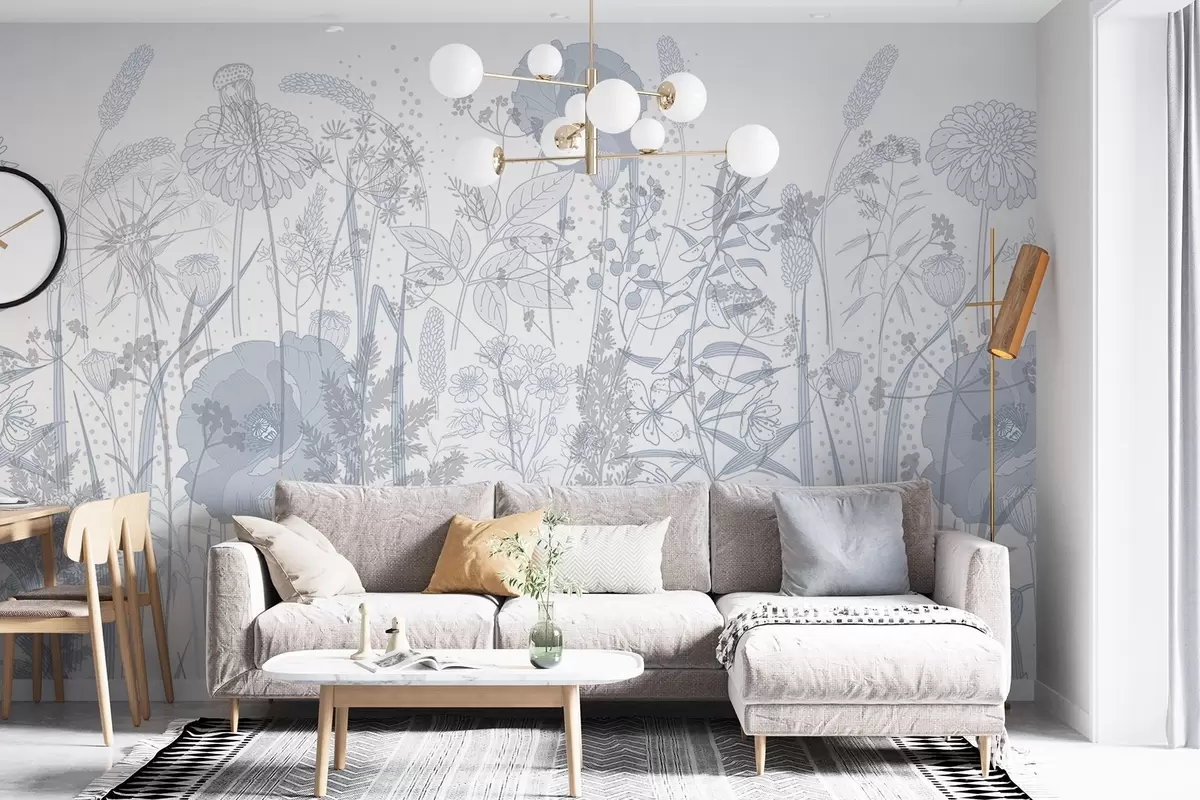 Fototapetak Magas virágok és fű világoskék pasztell tónusú mezője fehér alapon Nr. w08829