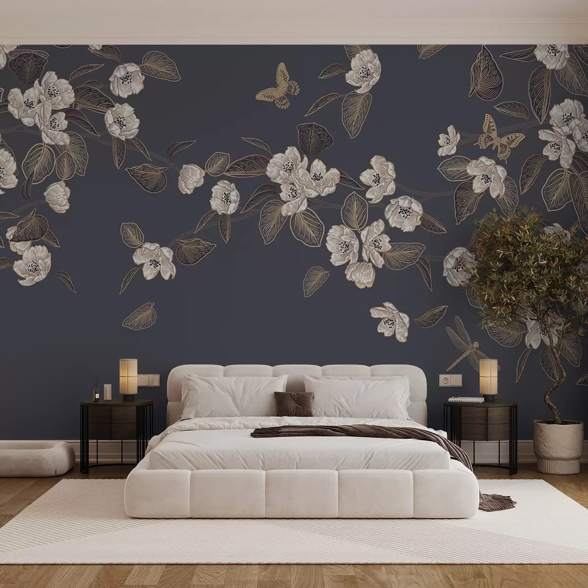 Fototapetak Cseresznyefa virágos ága virágokkal, levelekkel, pillangókkal sötétszürke háttéren Nr. w08830