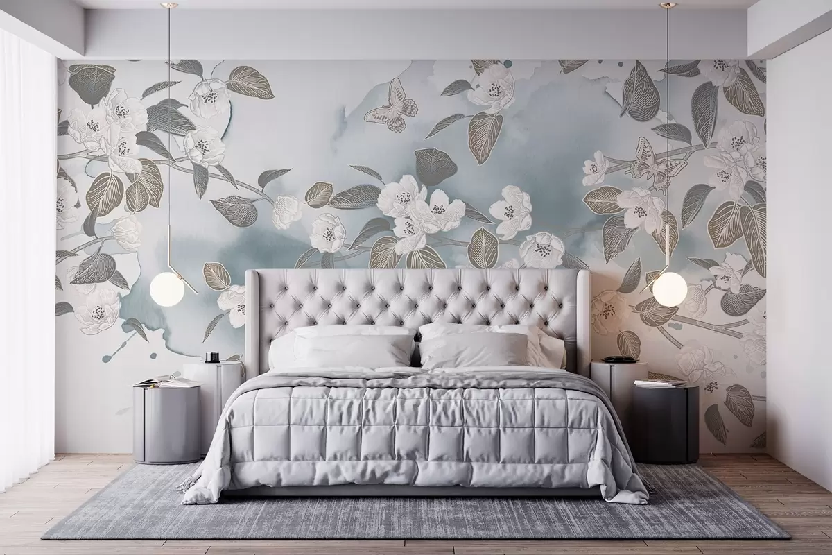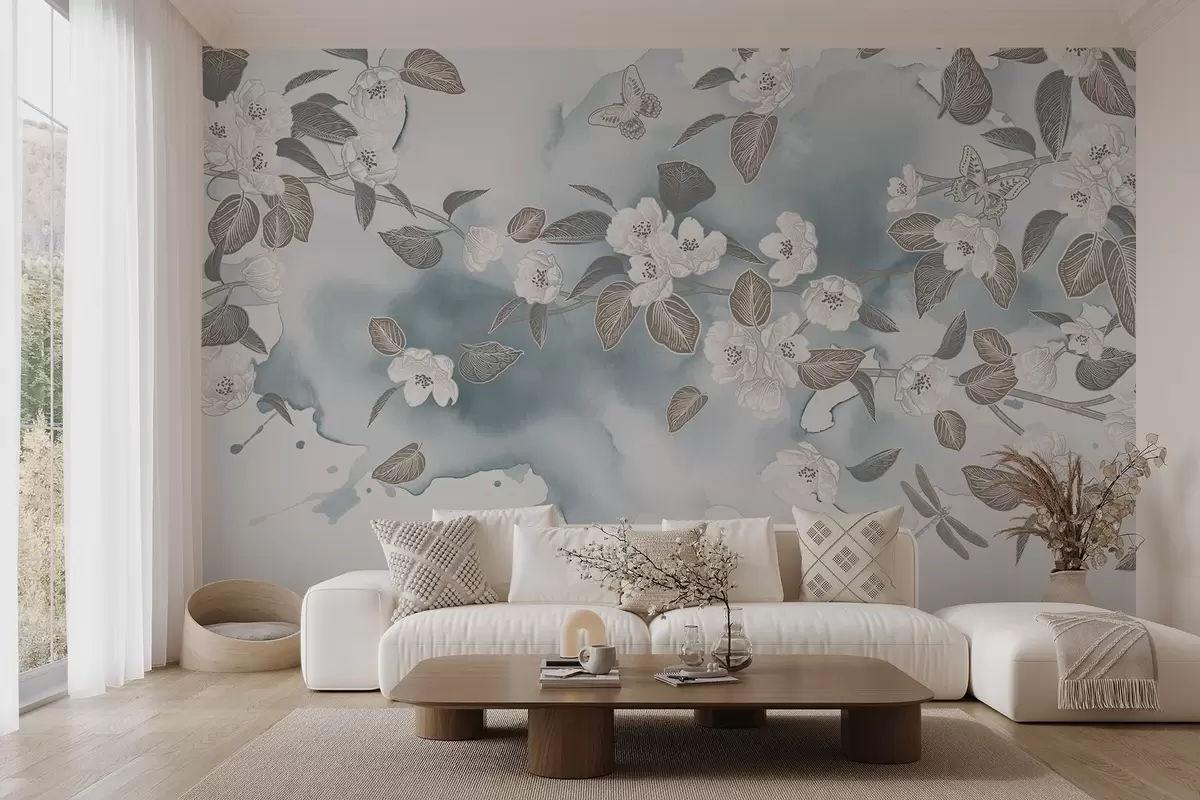 Fototapetak Cseresznyefa virágos ága virágokkal, levelekkel, pillangókkal világoskék akvarell textúrás háttéren Nr. w08831v1