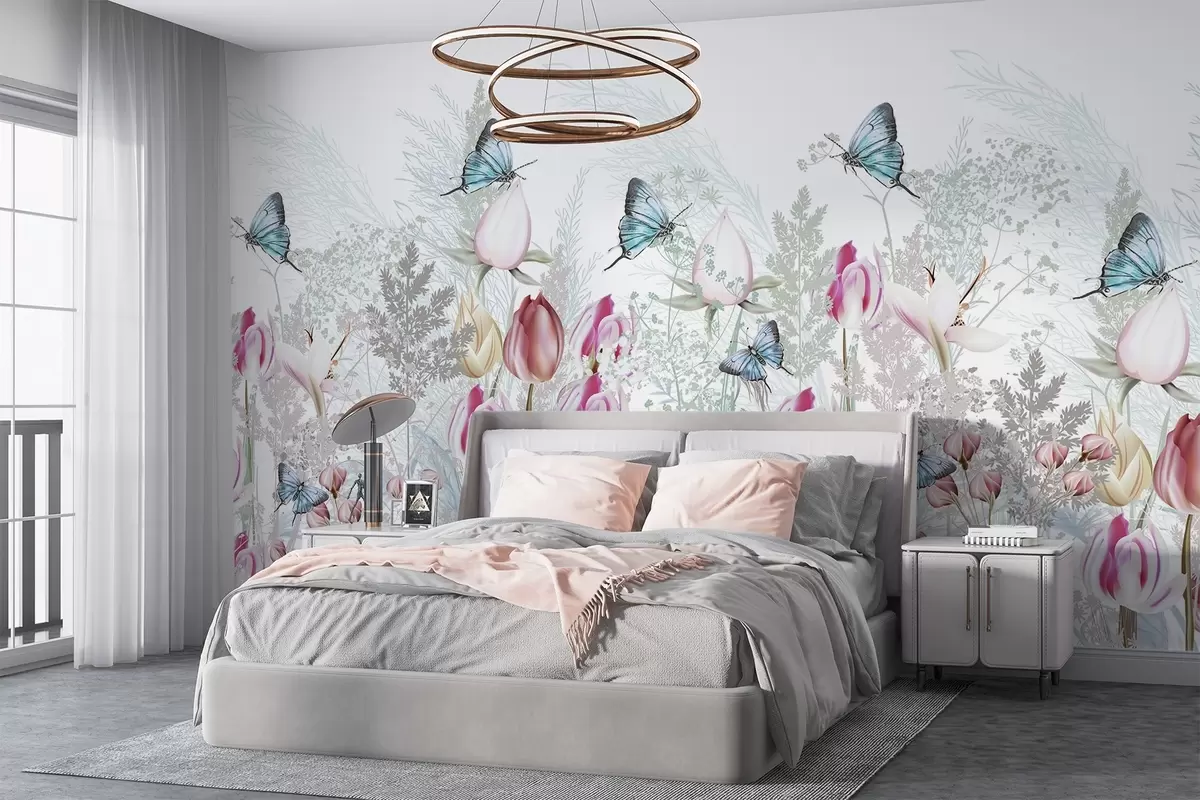 Fototapetak Pasztell nyomtatás tulipán virágokkal, fűvel és pillangókkal, amelyek egy kertben repülnek Nr. w08834