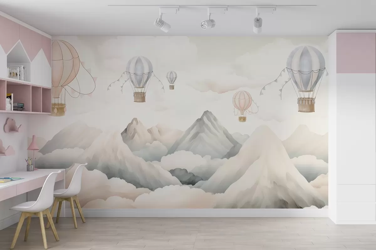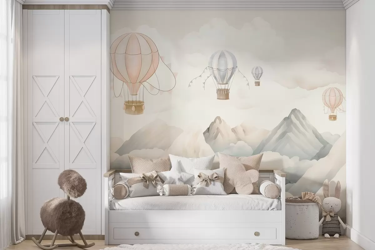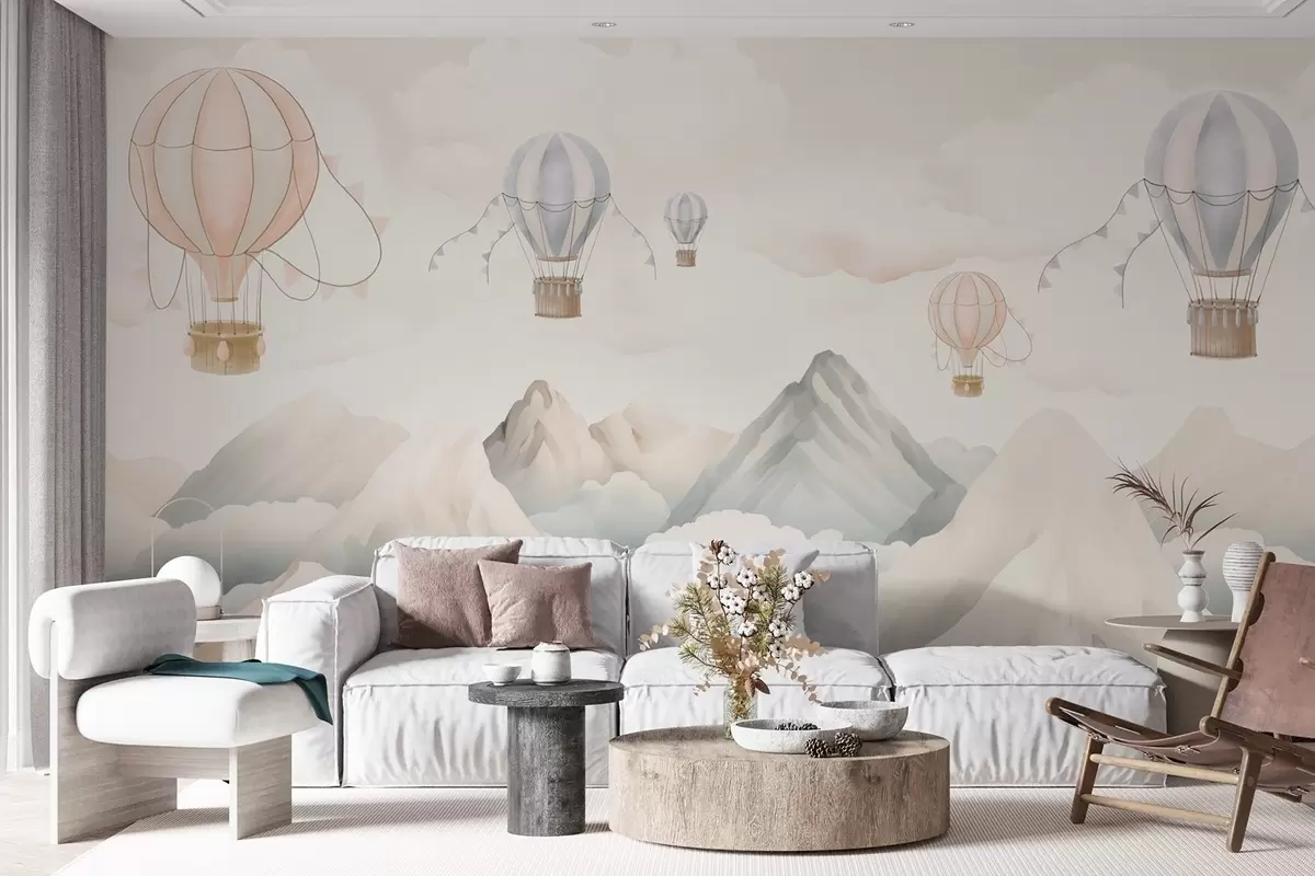 Fototapetak Hőlégballonok lebegnek a hegyek felett semleges, lágy pasztellszínekben Nr. w08853