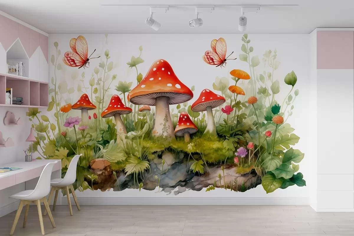 Fototapetak Erdei táj fehér háttéren, akvarell stílusban, gombákkal, békákkal és pillangókkal Nr. w08854