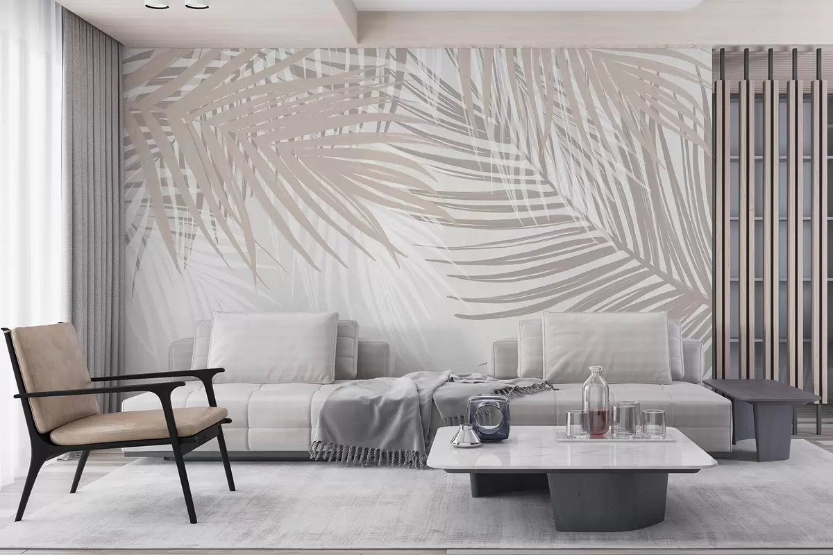 Fototapetak Pálmalevelek világos bézs és fehér tónusokban, trópusi lombozat, lágy pasztell színek, minimalista design Nr. w08869