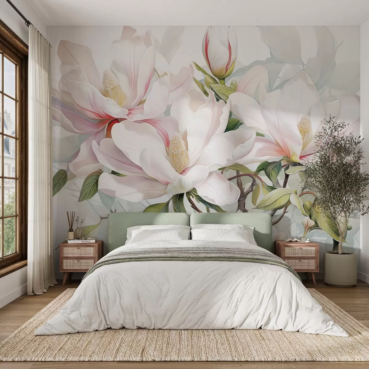 Fototapetak Magnólia virágok fehér és rózsaszín szirmokkal, levelekkel és barna ágakkal, lágy és finom akvarell stílusban Nr. w08885