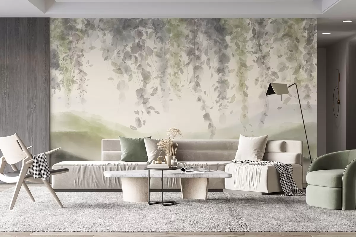 Fototapetak Lágy pasztell zöld és bézs színek, akvarell stílusú tájkép, kéklő hegyek fölött lógó golgotavirág levelek Nr. w08909v2