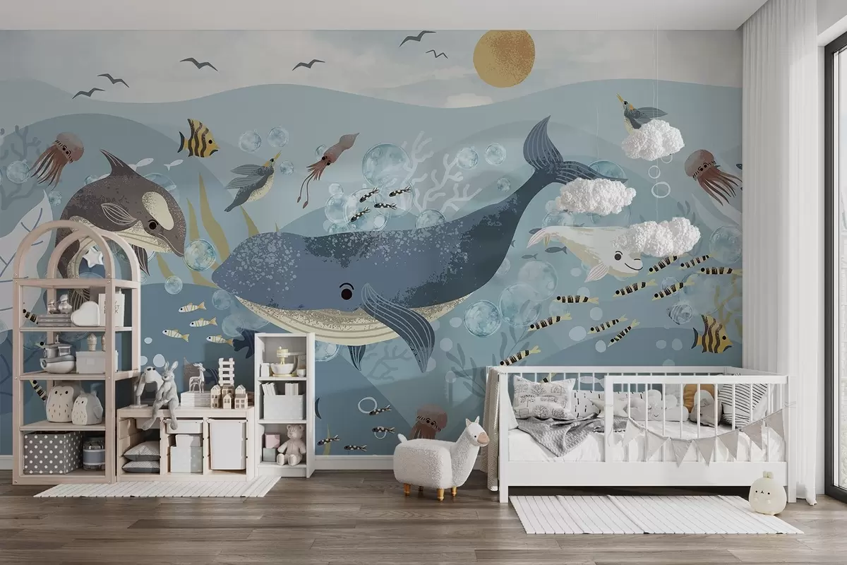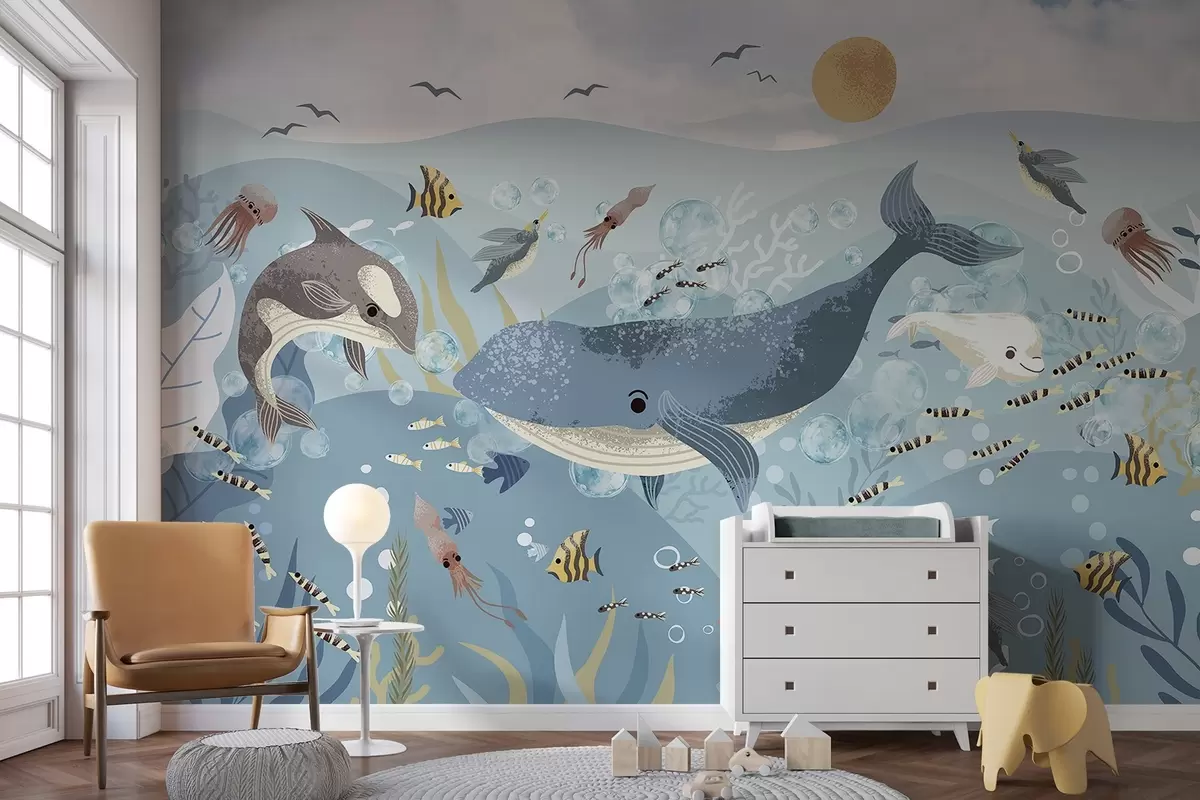 Fototapetak Gyerekek illusztráció aranyos nyomtatás kék bálna körül halak, tintahalak, medúzák egy kék óceánban buborékokkal körülvéve Nr. w08921