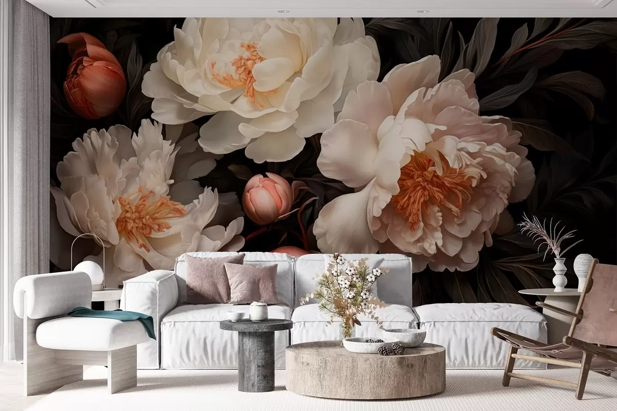 Fototapetak Fehér nagy bazsarózsa piros bimbókkal sötét háttéren Nr. w08965