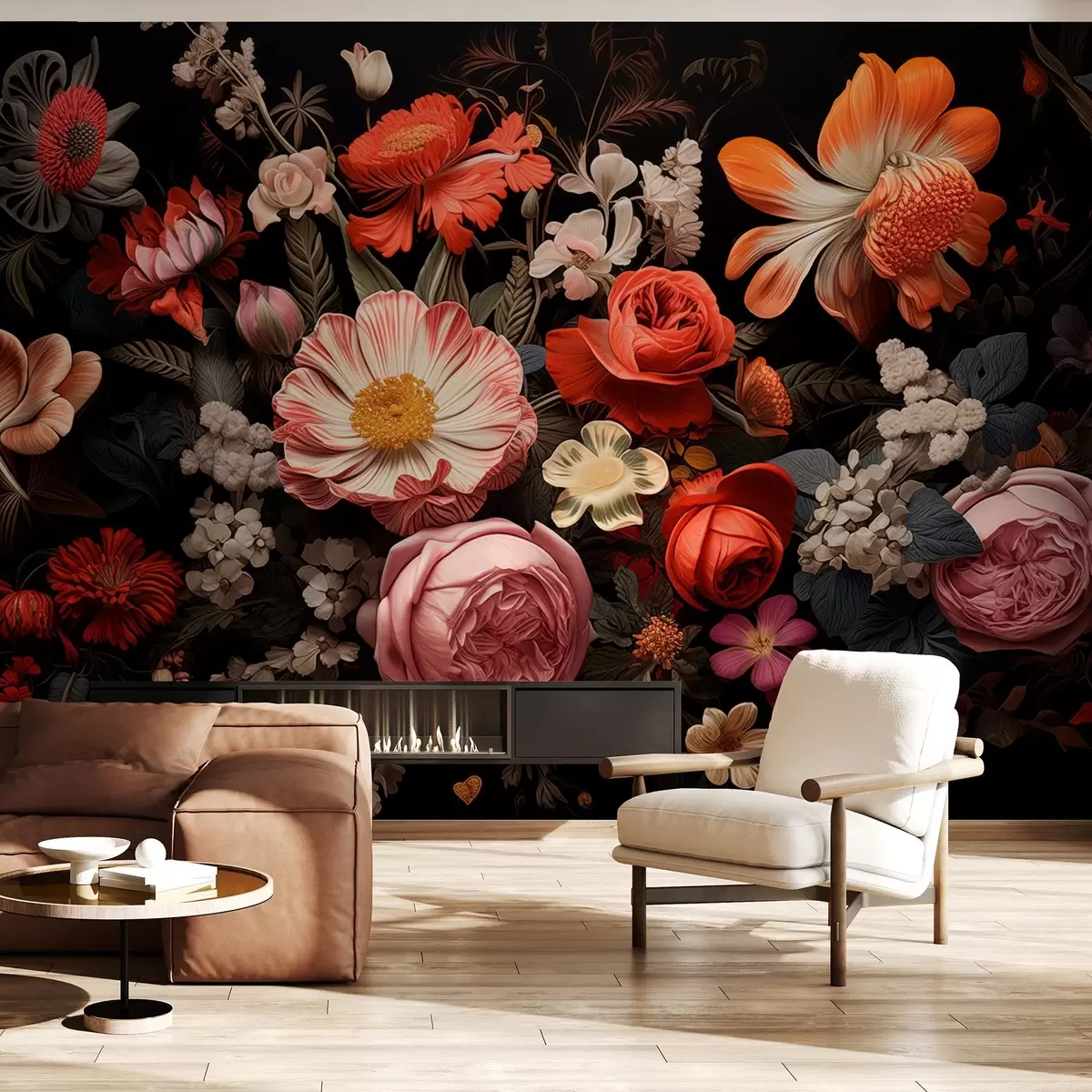 Fototapetak Színes csokor különböző virágokból sötét háttéren meleg tónusokban Nr. w08969
