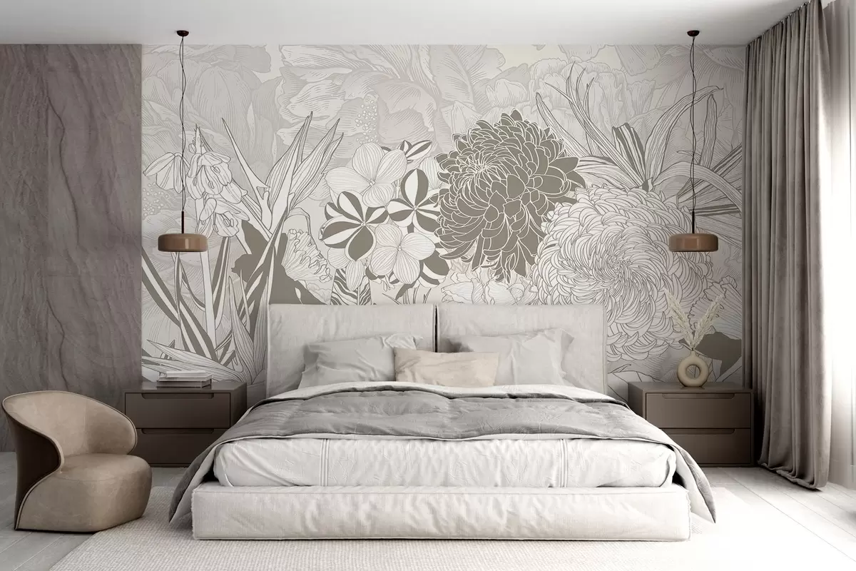 Fototapetak Virágok és levelek bézs árnyalatokban, köztük krizantémok, plumeria és trópusi lombozat, botanikus design Nr. w08976