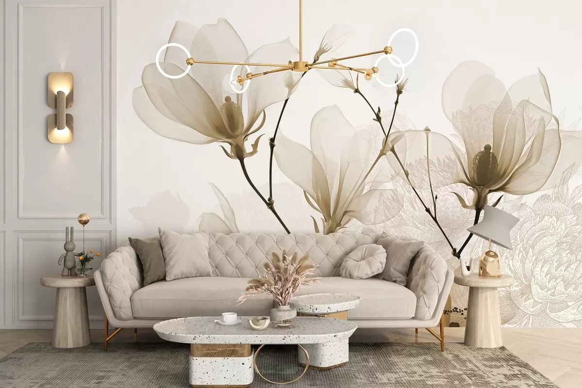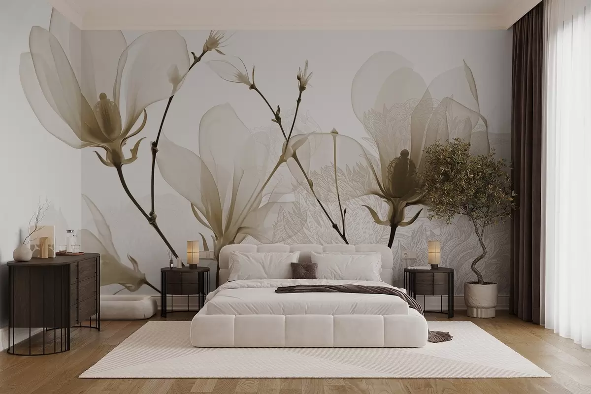 Fototapetak Áttetsző bézs magnólia virágok sziluettekkel, finom szirmokkal és sötét szárakkal Nr. w08978v1