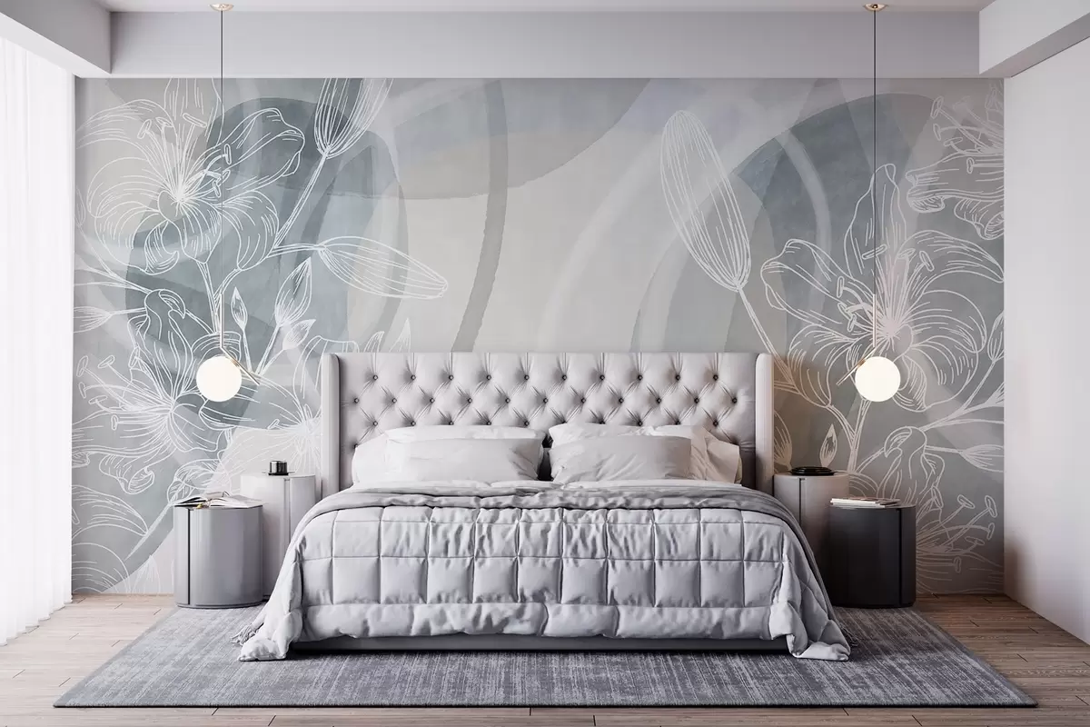 Fototapetak Minimalista virágos design fehér line art virágokkal és levelekkel, átfedő absztrakt körökkel a szürke és a kék árnyalataiban Nr. w08979