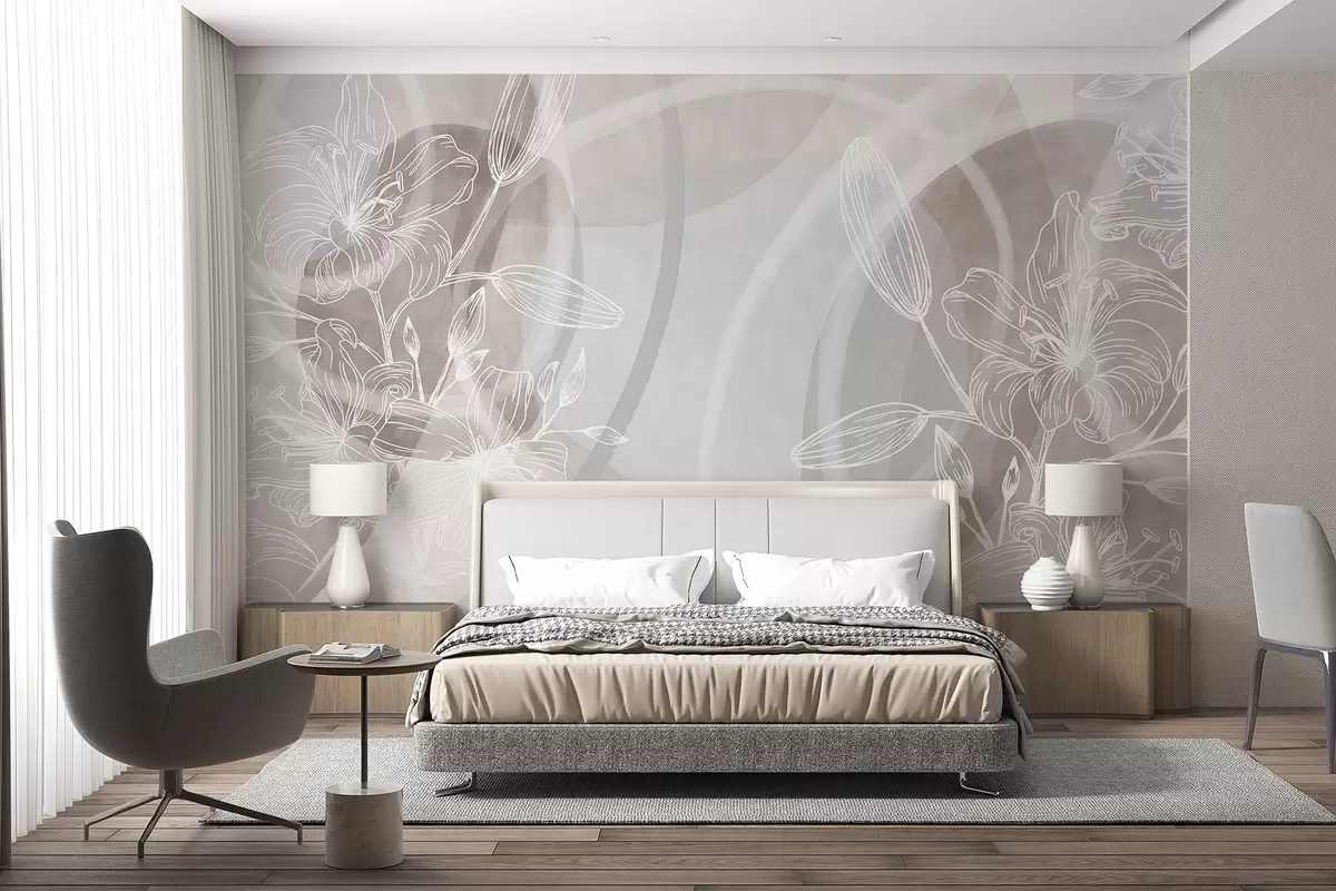 Fototapetak Minimalista virágos design fehér line art virágokkal és levelekkel, átfedő absztrakt körökkel bézs és kék árnyalatokban Nr. w08979v1