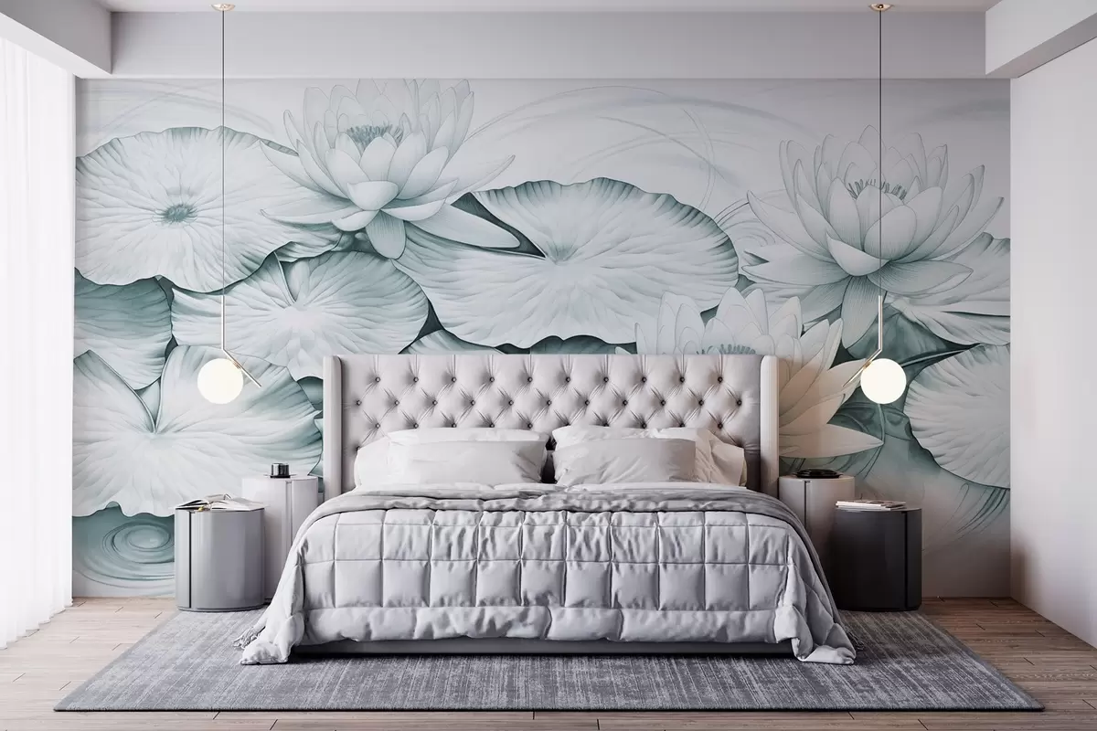 Fototapetak Tavi liliom és liliom párnák egy tóban, türkiz és fehér utánzata ceruza rajz, részletes botanikai illusztráció, természet művészet Nr. w09006v1