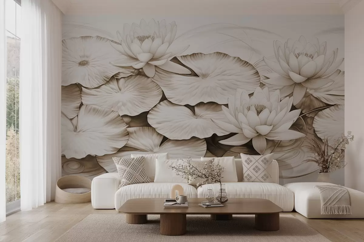 Fototapetak Tavi liliom és liliompárnák egy tóban, barna és fehér ceruzarajz utánzata, részletes botanikai illusztráció, természet művészet Nr. w09006v2