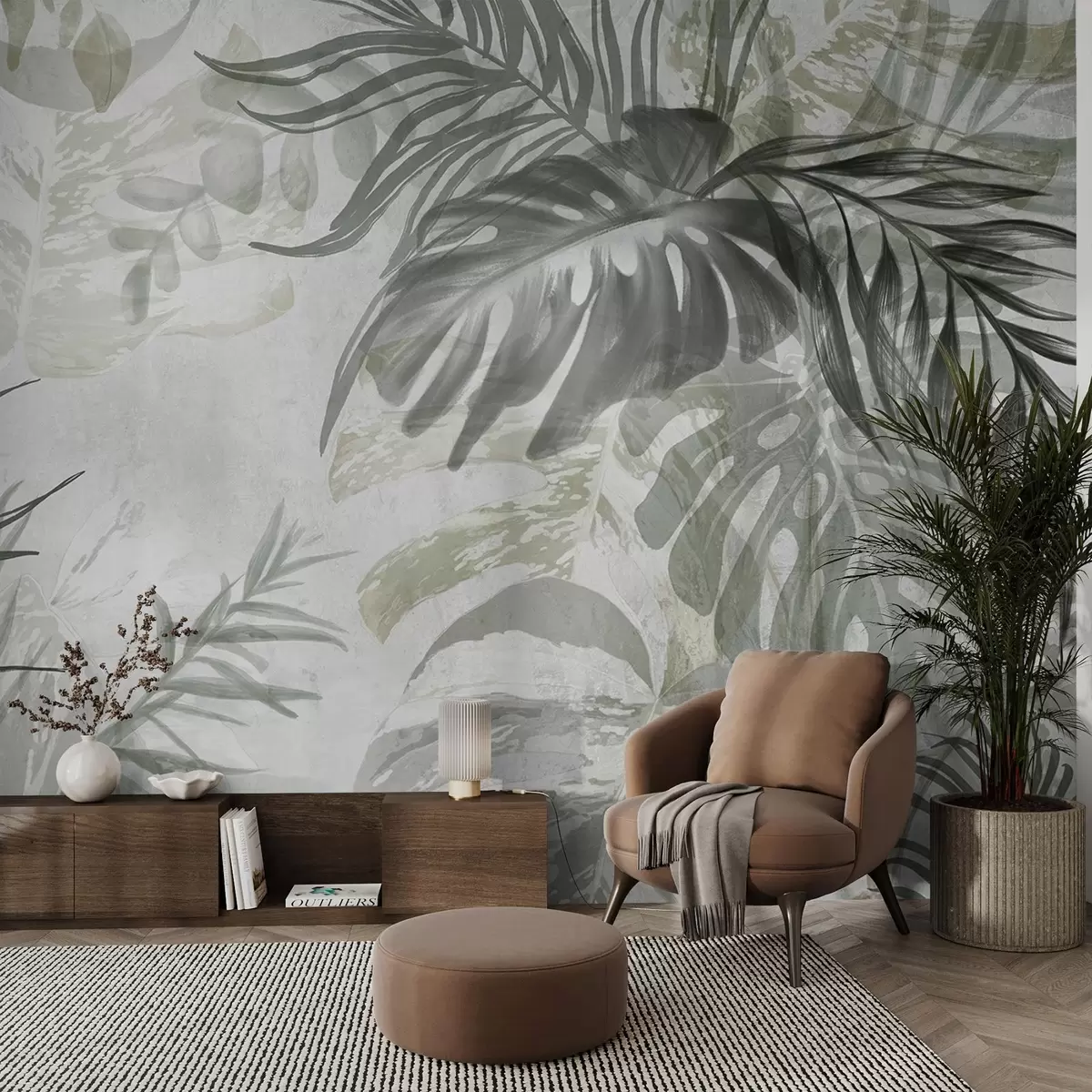 Fototapetak Monstera és pálmalevelek a zöld és szürke árnyalataiban, botanikai, trópusi lombozat, dzsungel növények, texturált háttér Nr. w09011