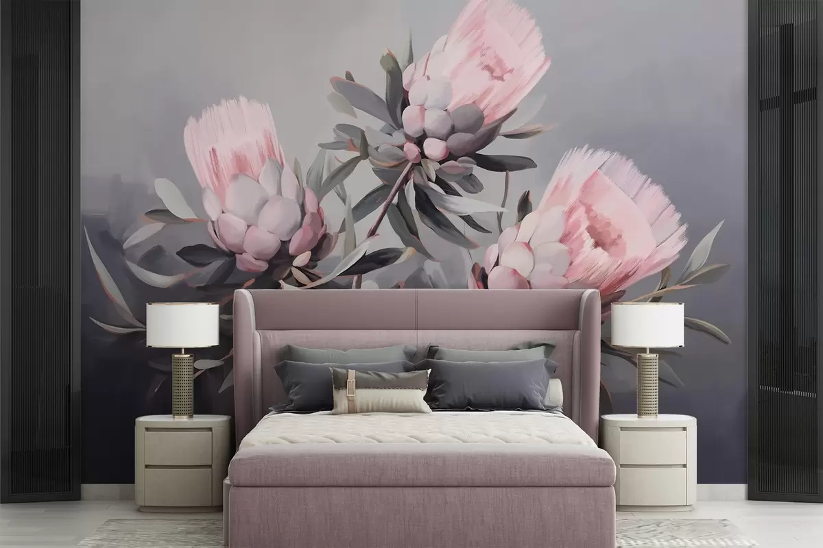 Fototapetak Rózsaszín protea absztrakt virágok szürke levelekkel, lágy textúrájú ecsetvonásokkal, tompa színekkel, elmosódott szürke háttér előtt Nr. w09014