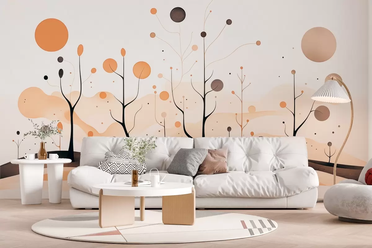 Fototapetak Absztrakt fák gömbökkel és nap bézs-szürke árnyalatokkal Nr. w09043