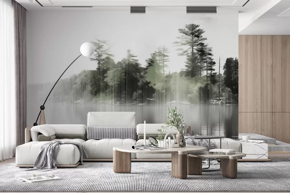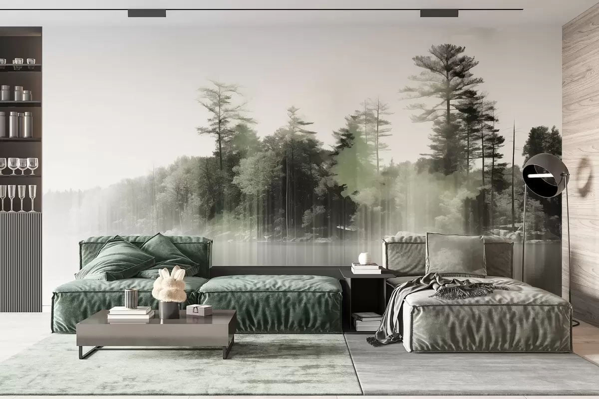 Fototapetak Absztrakt minimalizmus texturált táj egy tó és a fák tükröződések a vízben zöld és fehér árnyalatokban Nr. w09058