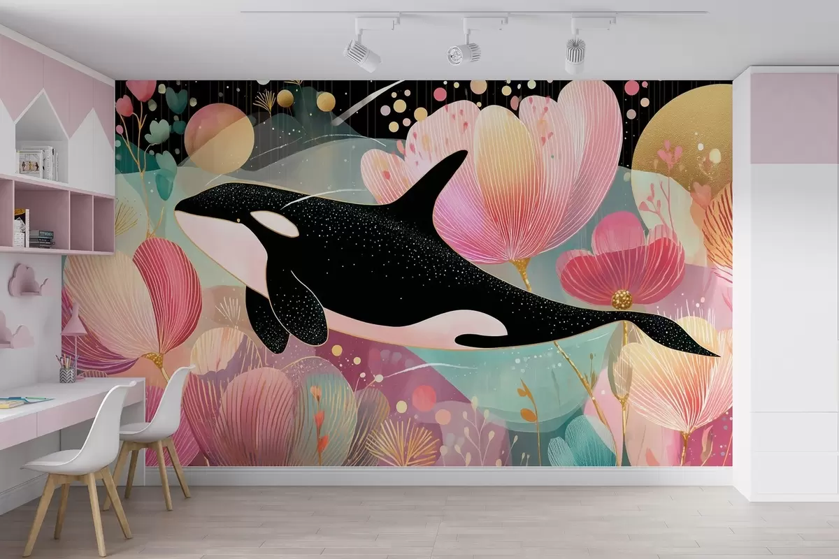 Fototapetak Úszó fekete orca rózsaszín virágok hátterében Nr. w09074