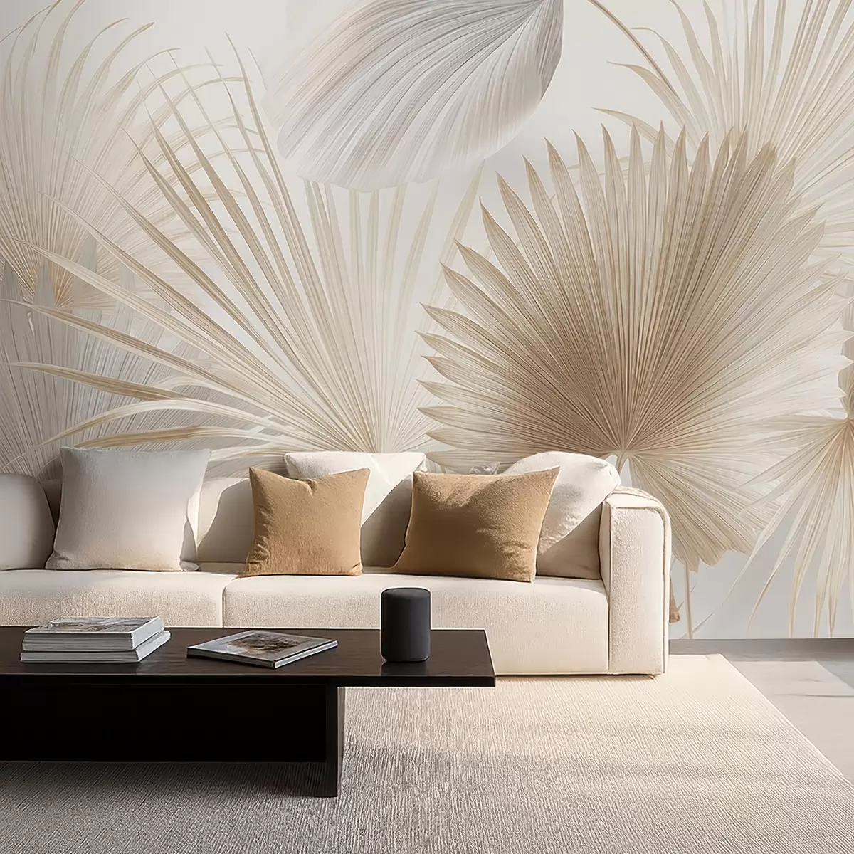 Fototapetak Lágy trópusi leveles legyezők világos bézs és kékes árnyalatokban Nr. w09084