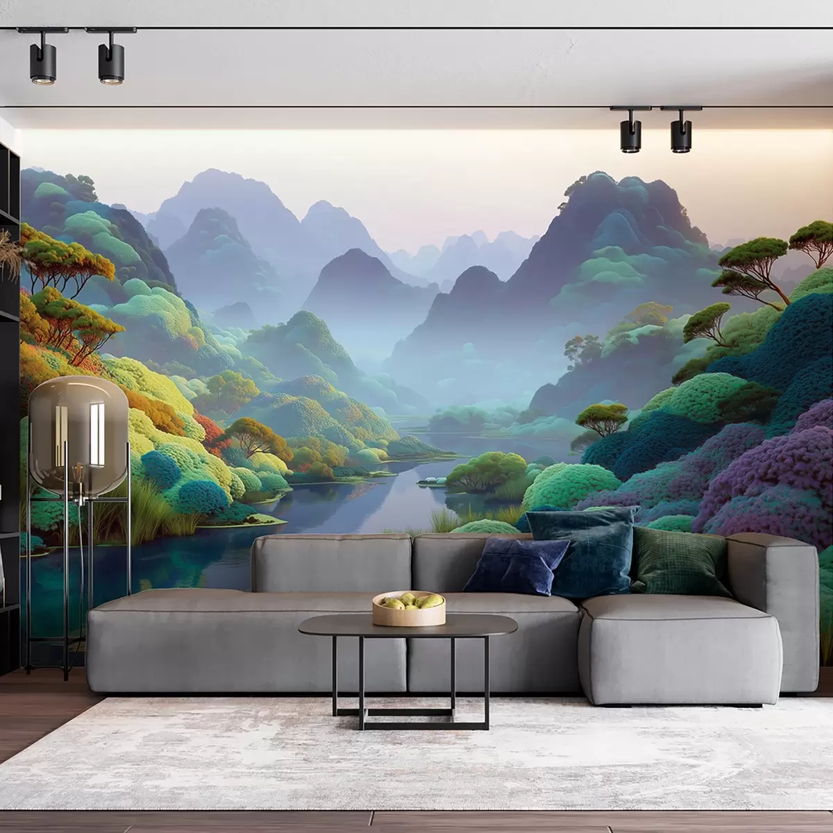 Fototapetak Hegyvidéki táj egy folyó kék tónusú fákkal és bokrokkal Nr. w09088