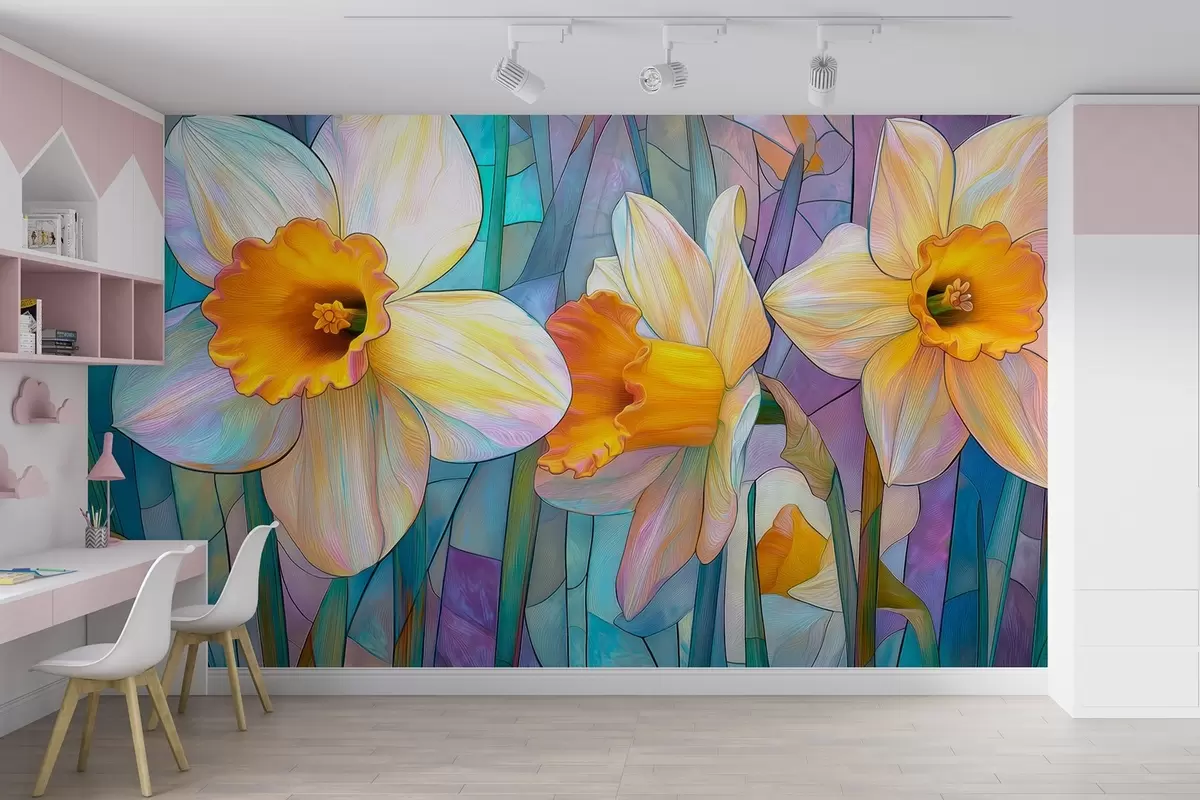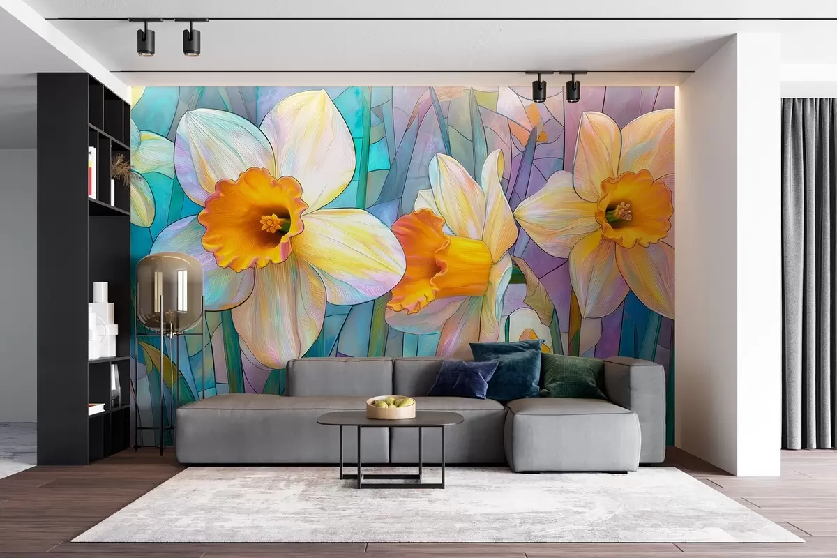 Fototapetak Színes nárciszok kék-ibolya ólomüveg háttéren Nr. w09092