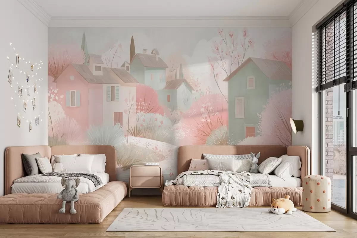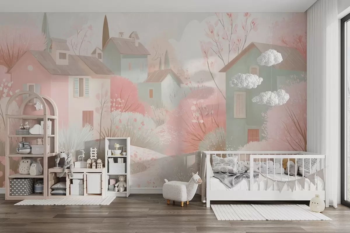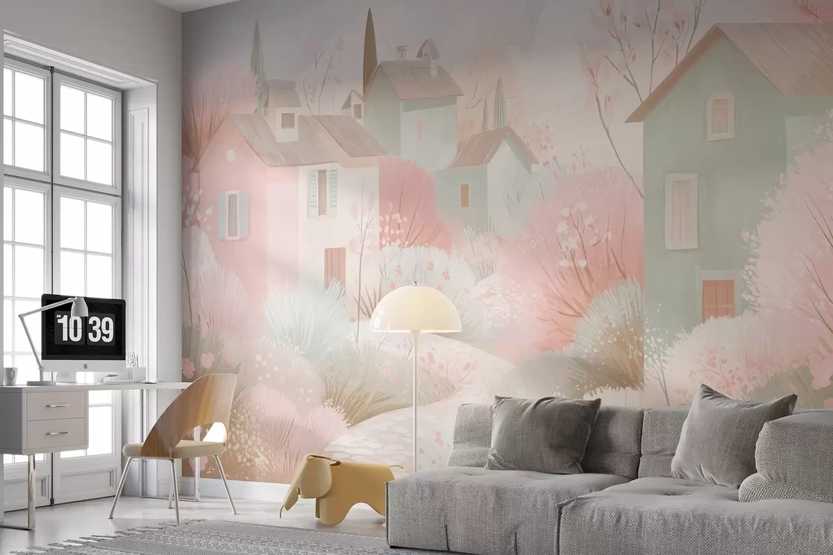 Fototapetak Mesebeli város olajfestmény stílusban rózsaszín árnyalatokban Nr. w09095