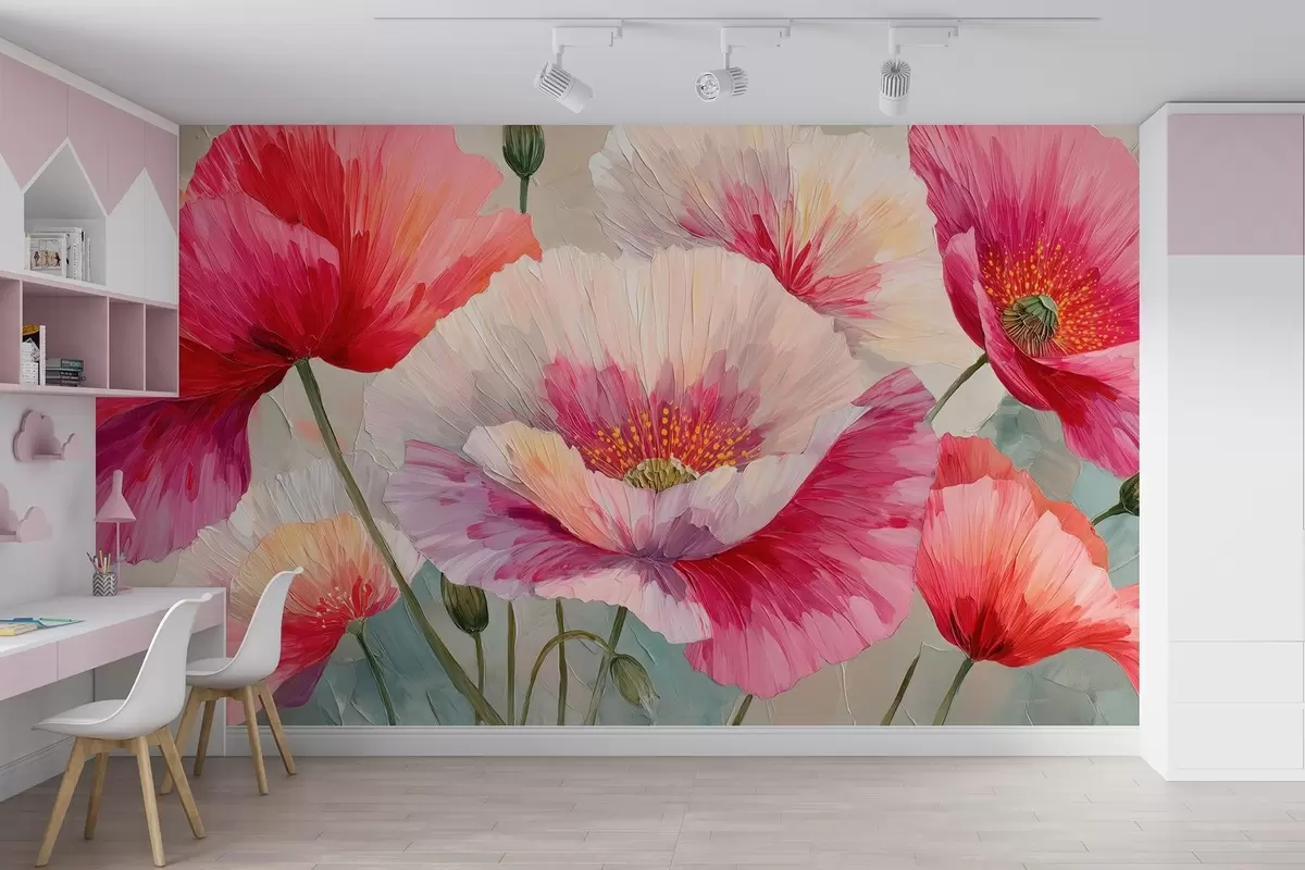 Fototapetak Fehér és piros pipacsok olajfestmény stílusban, merész ecsetvonásokkal Nr. w09097