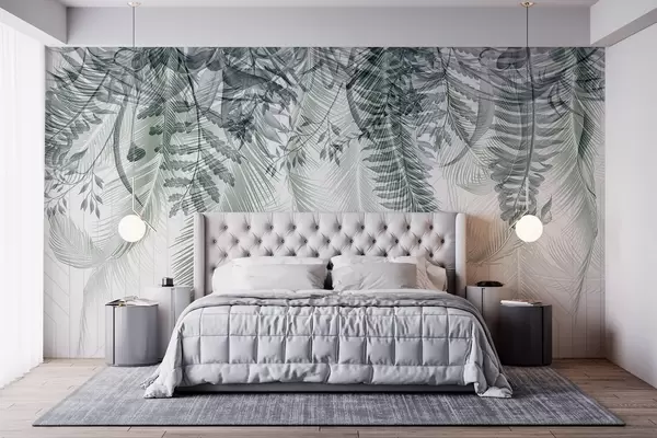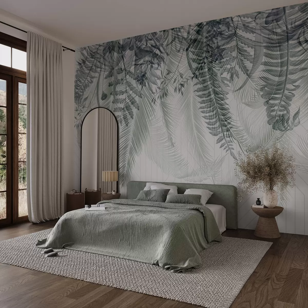 Fototapetak Finoman hulló trópusi páfrány és pálmalevelek, geometrikus háttér, lágy fény, tompa színek, elegáns Nr. w09106