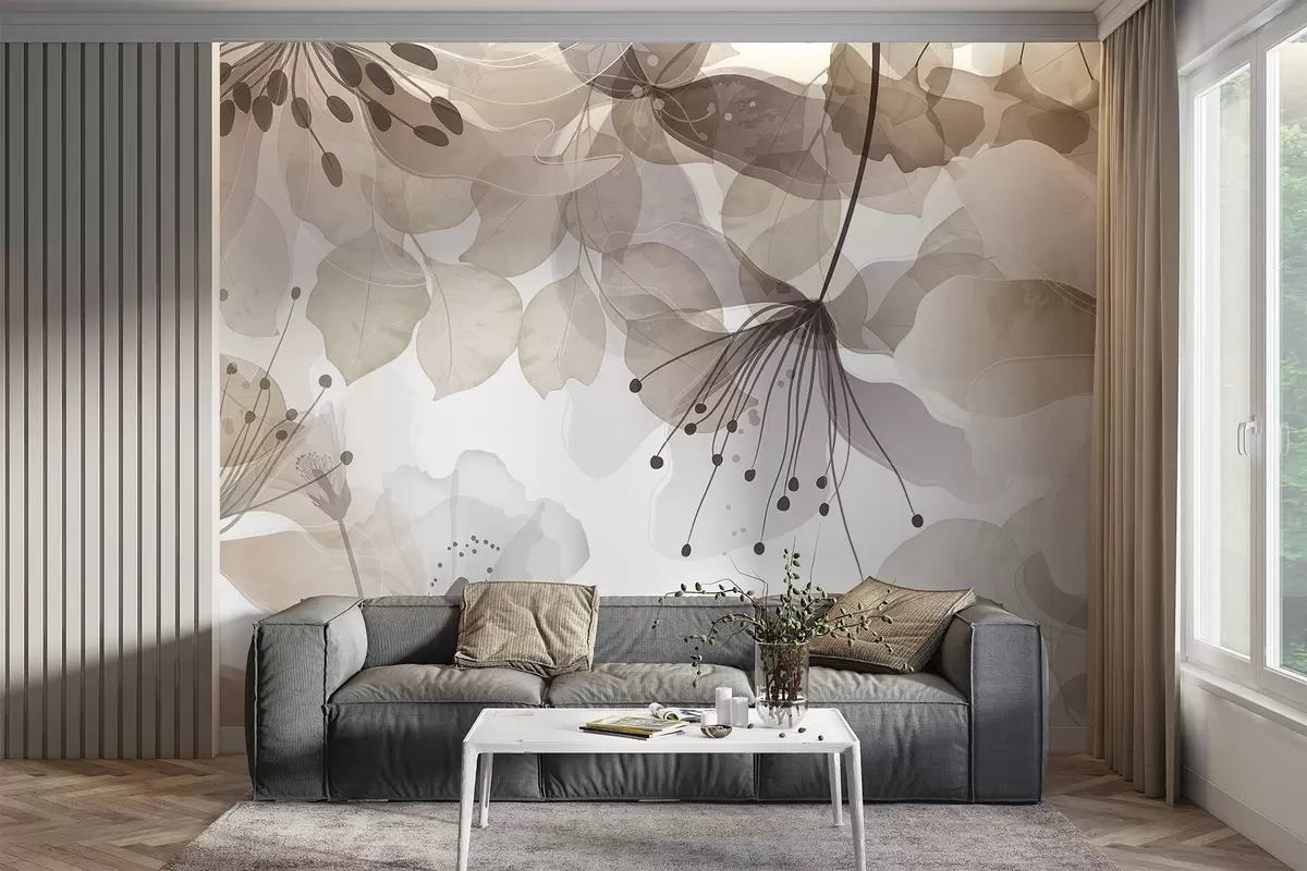 Fototapetak Virágok és levelek bézs színben, áttetsző szirmok és levelek, lágy akvarell hatás, finom vonalak, fehér háttér Nr. w09107v1