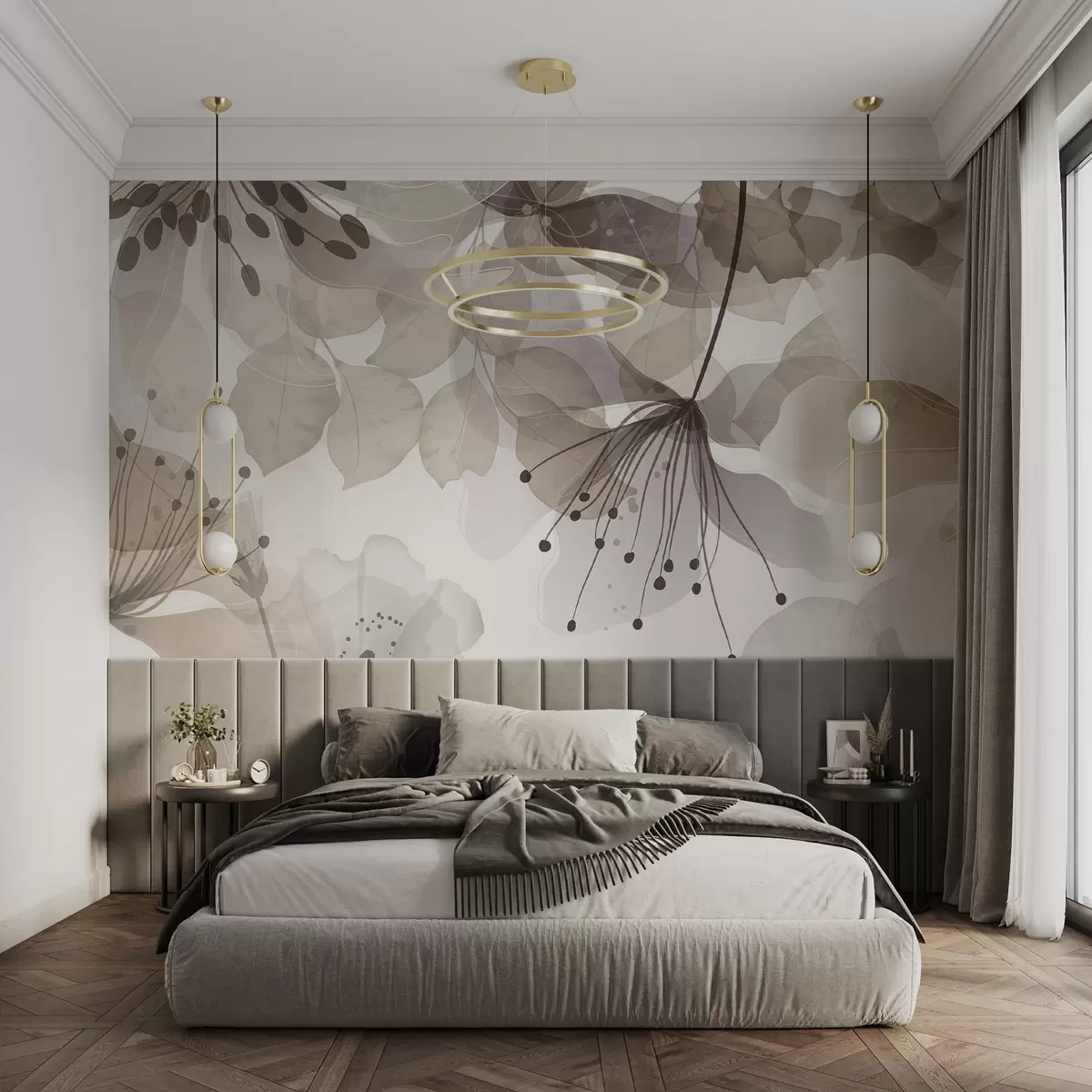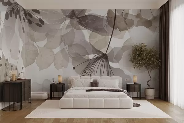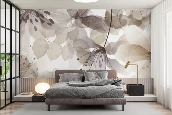 Fototapetak Virágok és levelek bézs színben, áttetsző szirmok és levelek, lágy akvarell hatás, finom vonalak, fehér háttér Nr. w09107v1