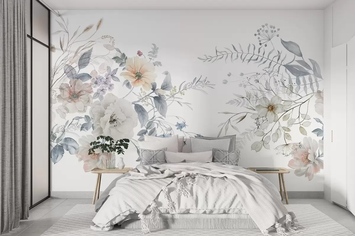 Fototapetak Virágos elrendezés akvarell festmény stílusban fehér, barack és kék virágok, finom zöld növényzet fehér háttéren Nr. w09108