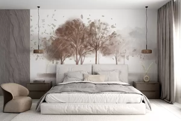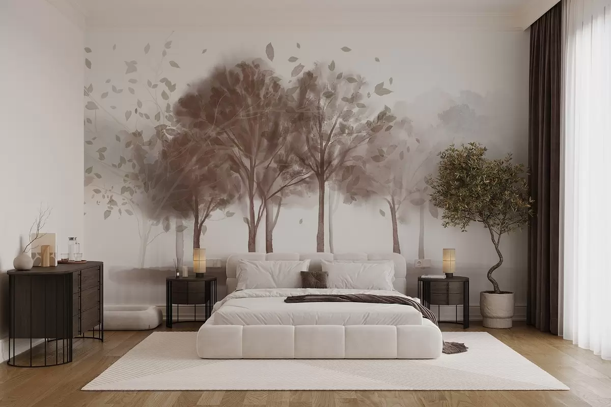 Fototapetak Absztrakt tájkép fákkal, barna levelekkel, amelyek a vízben tükröződnek, akvarell textúrázott stílusban Nr. w09109v1