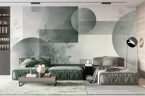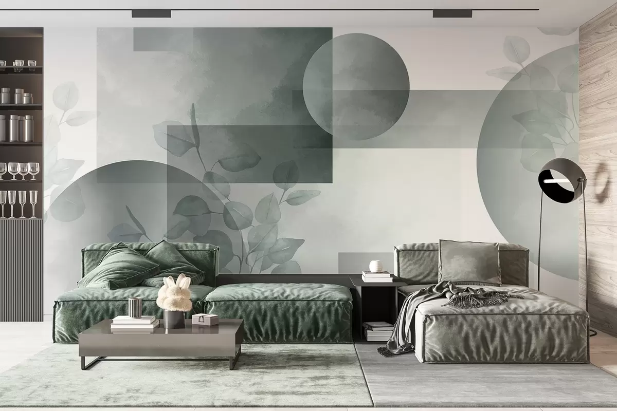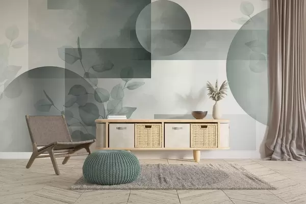 Fototapetak Absztrakt modern minimalista geometrikus design körökkel és téglalapokkal, eukaliptusz levelekkel, akvarell hatású Nr. w09110