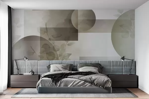 Fototapetak Absztrakt modern minimalista geometrikus design körökkel és téglalapokkal, eukaliptusz levelekkel, akvarell hatású Nr. w09110v1