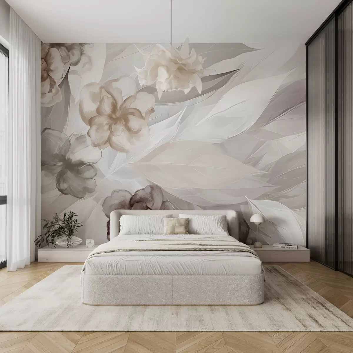 Fototapetak Finom virágok és levelek a fehér, barna és bézs árnyalataiban virágos háttér , lágy színek, finom szirmok Nr. w09111v1